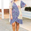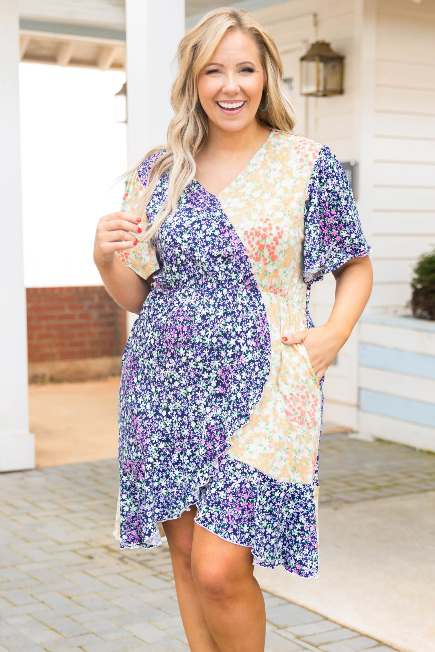 Fling into spring in this dress! This cutie has a navy color with a green color block that is super unique! The floral pattern is so stunning and the ruffle crossover look is so sweet! Style this with some wedges and bold accessories for a super cute outfit!