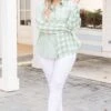 Take a stroll through the garden of fashion in this gorgeous top! This has a soft sage color with a trendy plaid pattern that is perfect for the season! Grab this cutie and style it with some skinnies and booties for a casual chic look!