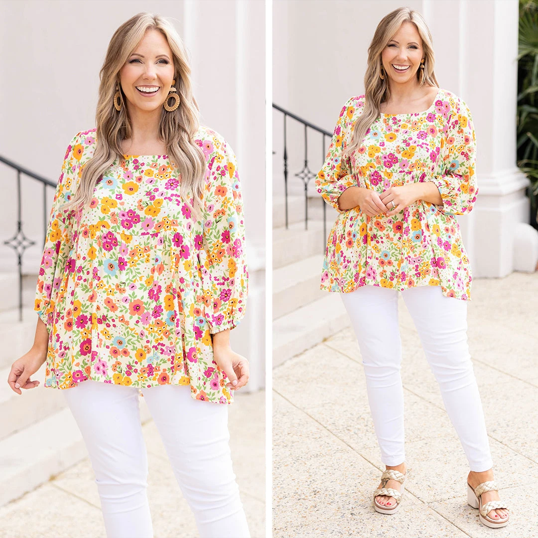 You’ll be as beautiful as a field full of flowers in this top! It has a bold color mix with a floral pattern that is just in time for the season! The babydoll design and flattering fit is great for pairing with skinnies and heels for a look you’ll never forget!