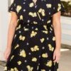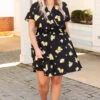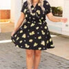 Carpe diem in this dress! The black color makes the lemon pattern really pop and the crossover bust is so flattering! Style this with slide sandals for a chic look!