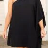 This dress is sure to become your new fave! The black color is so classic and the one-shoulder look is so trendy! This cutie has a flowy fit to flatter everyone and a bell sleeve for a stylish touch! Style it with gold wedges and some fun accessories for a perfect look!