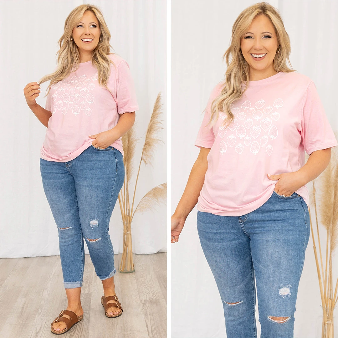 Stay fresh and cool in this cute graphic tee! The strawberry graphic is so cute and the pink color is adorable! This cutie is so soft and perfect for all day wear! Style it with some skinnies and sandals for a casual chic look!