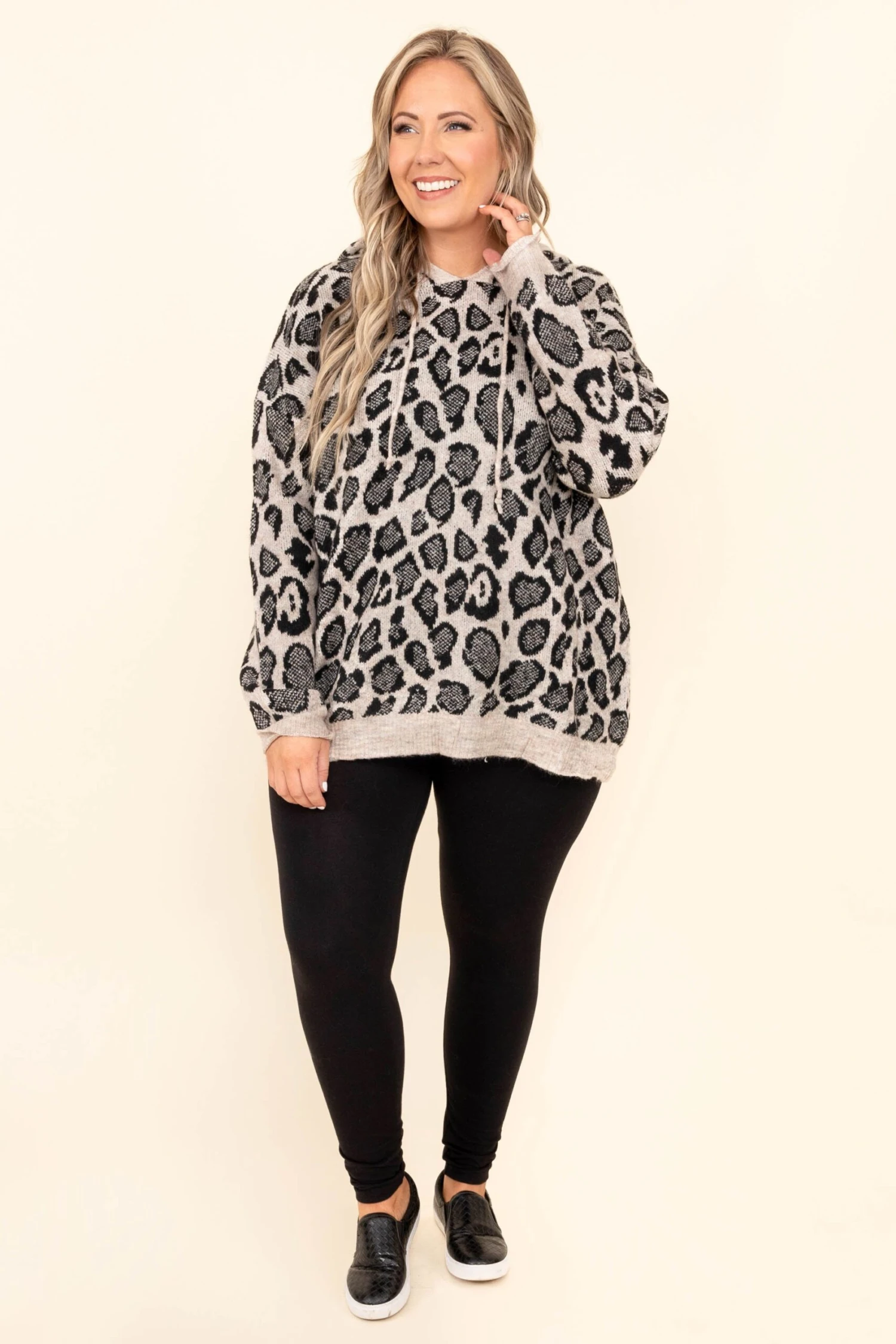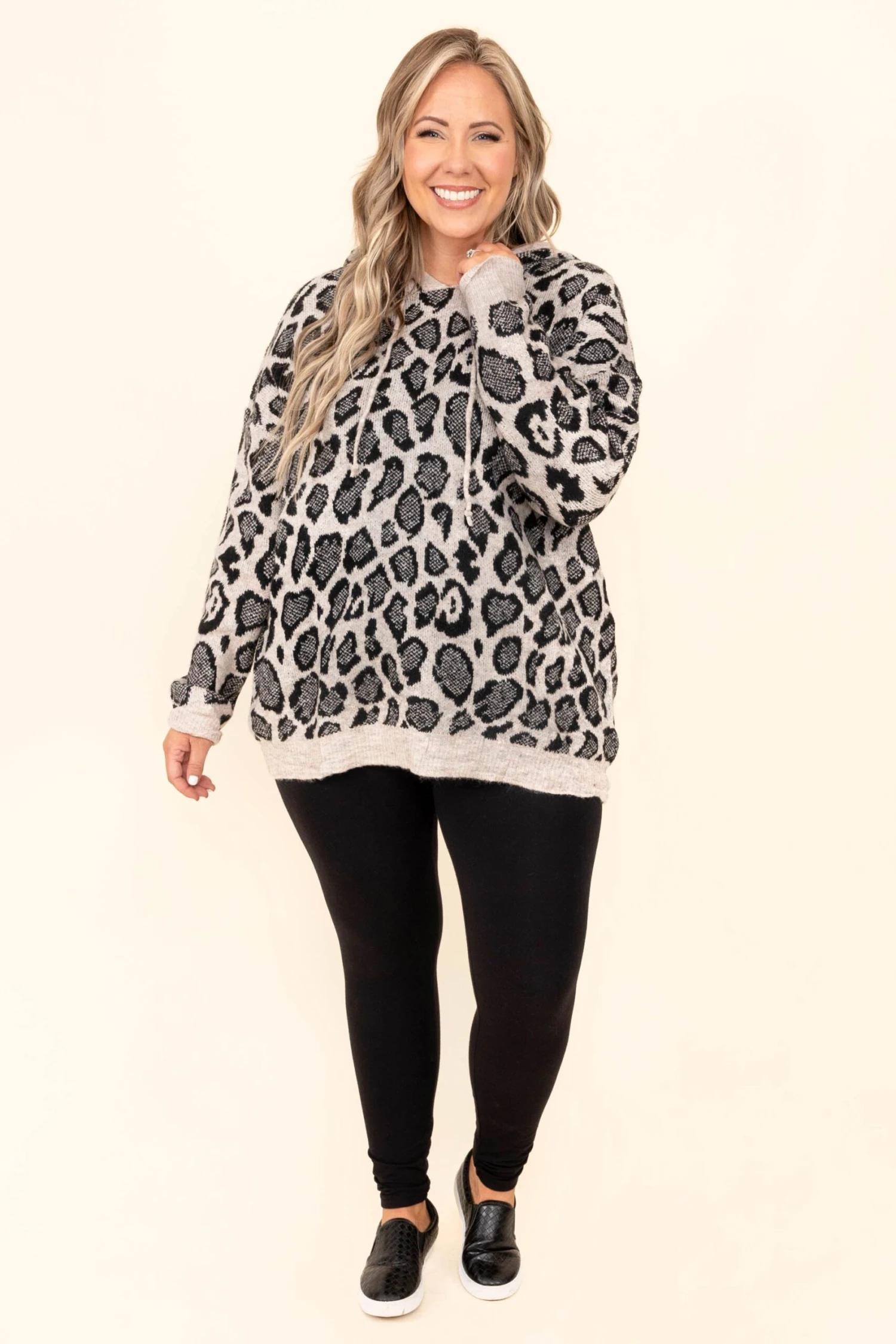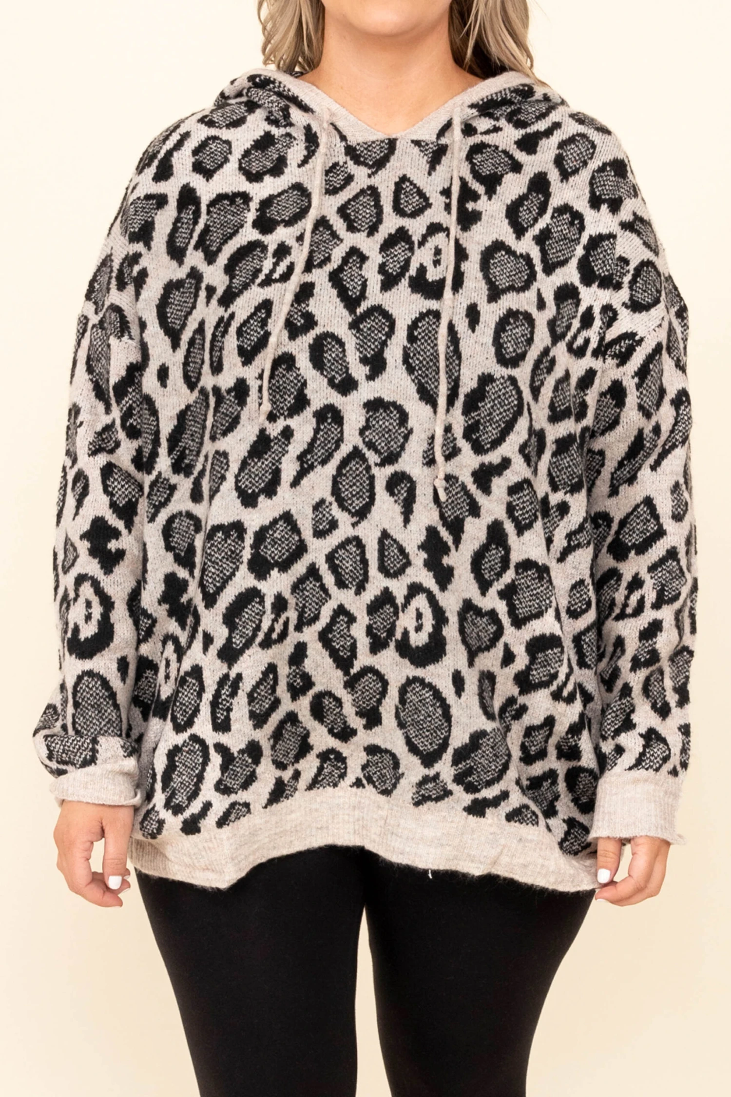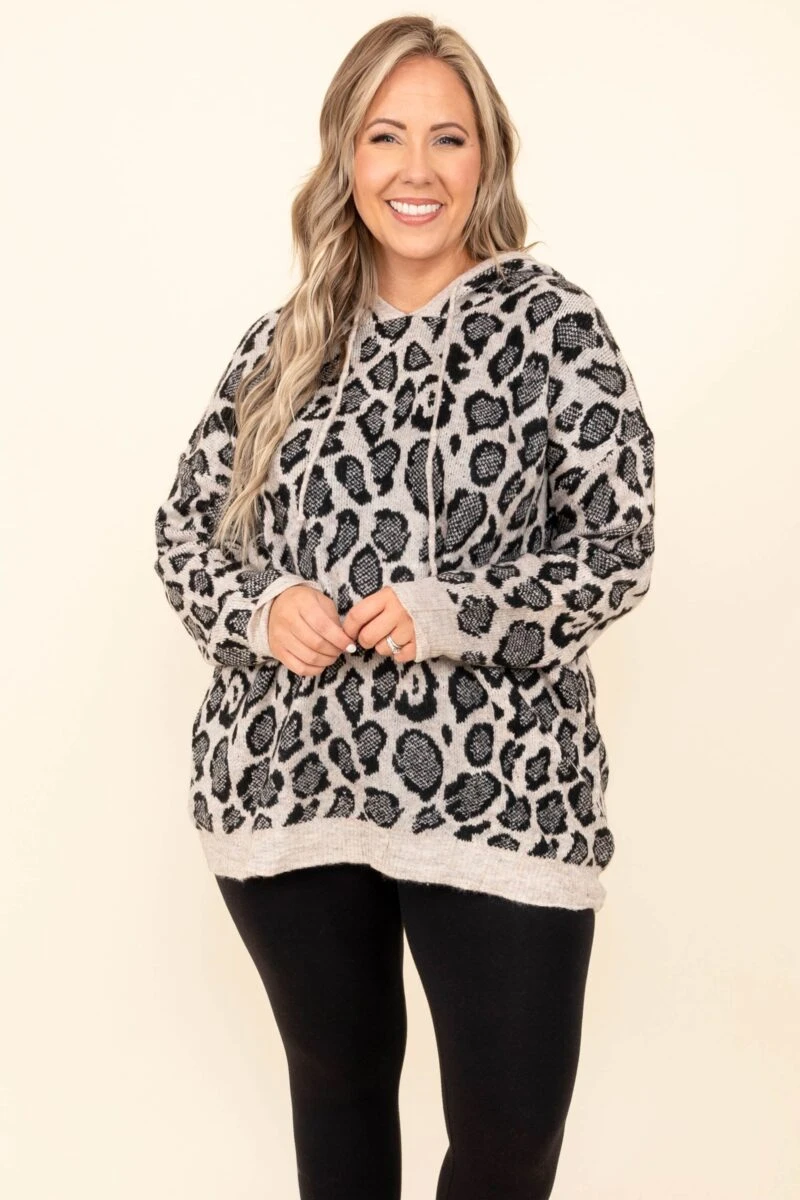 Explore your wild side in this fierce hoodie! The bold leopard pattern and lovely gray color work so well together! The stretchy, comfy fit is perfect for those cool days throughout the season! Style this hoodie with leggings or sneakers for a classic chic look!