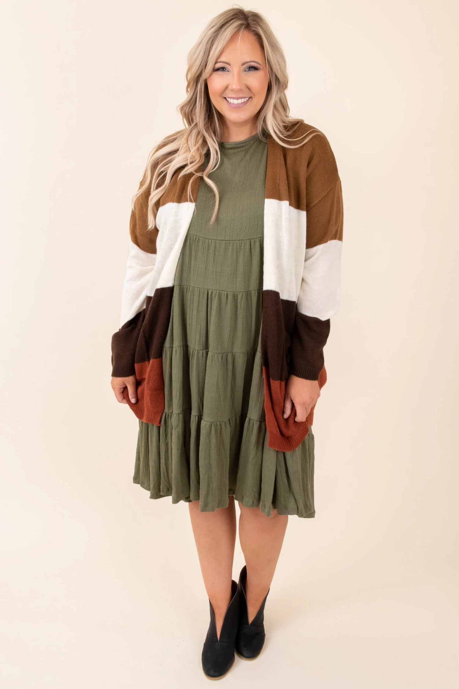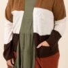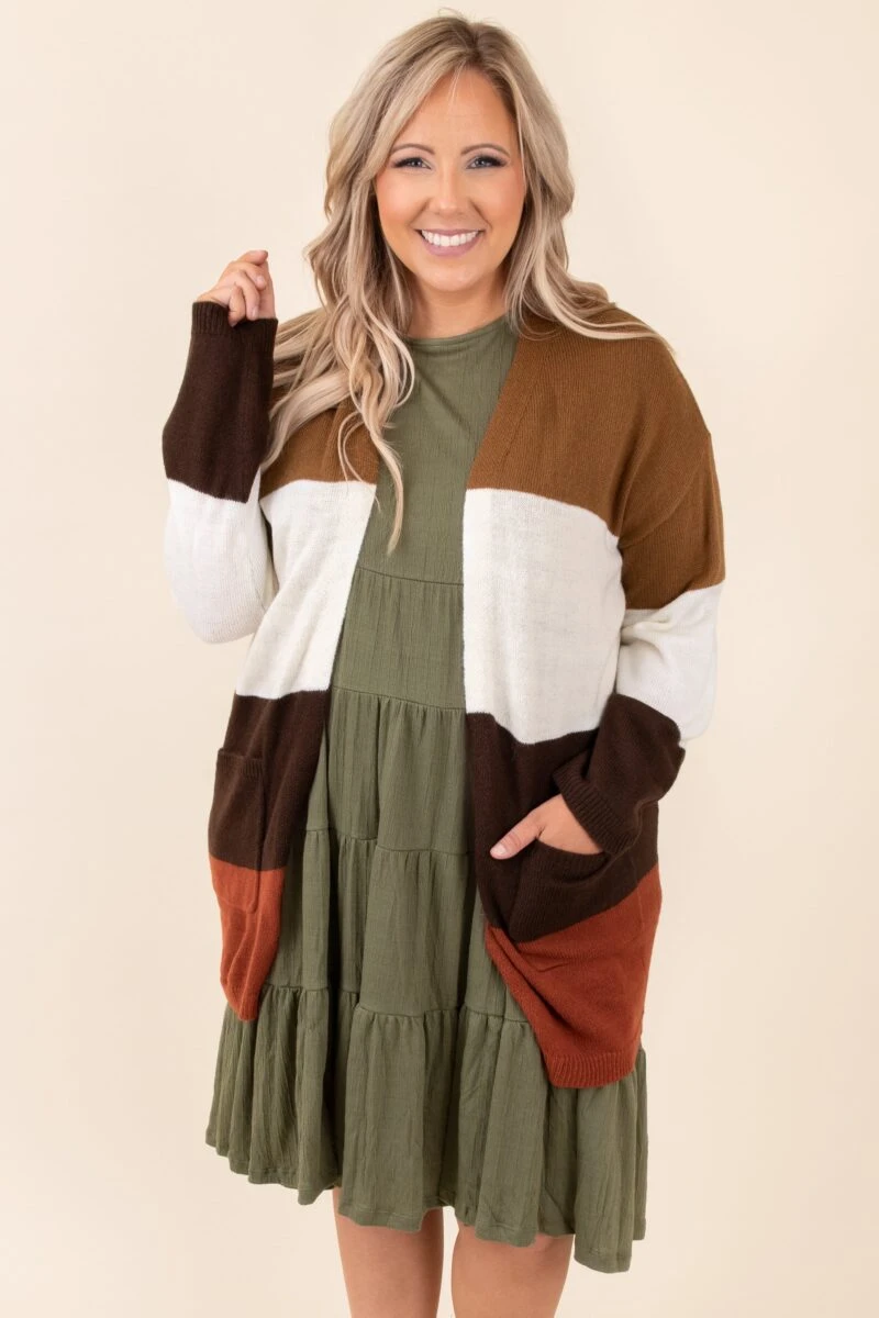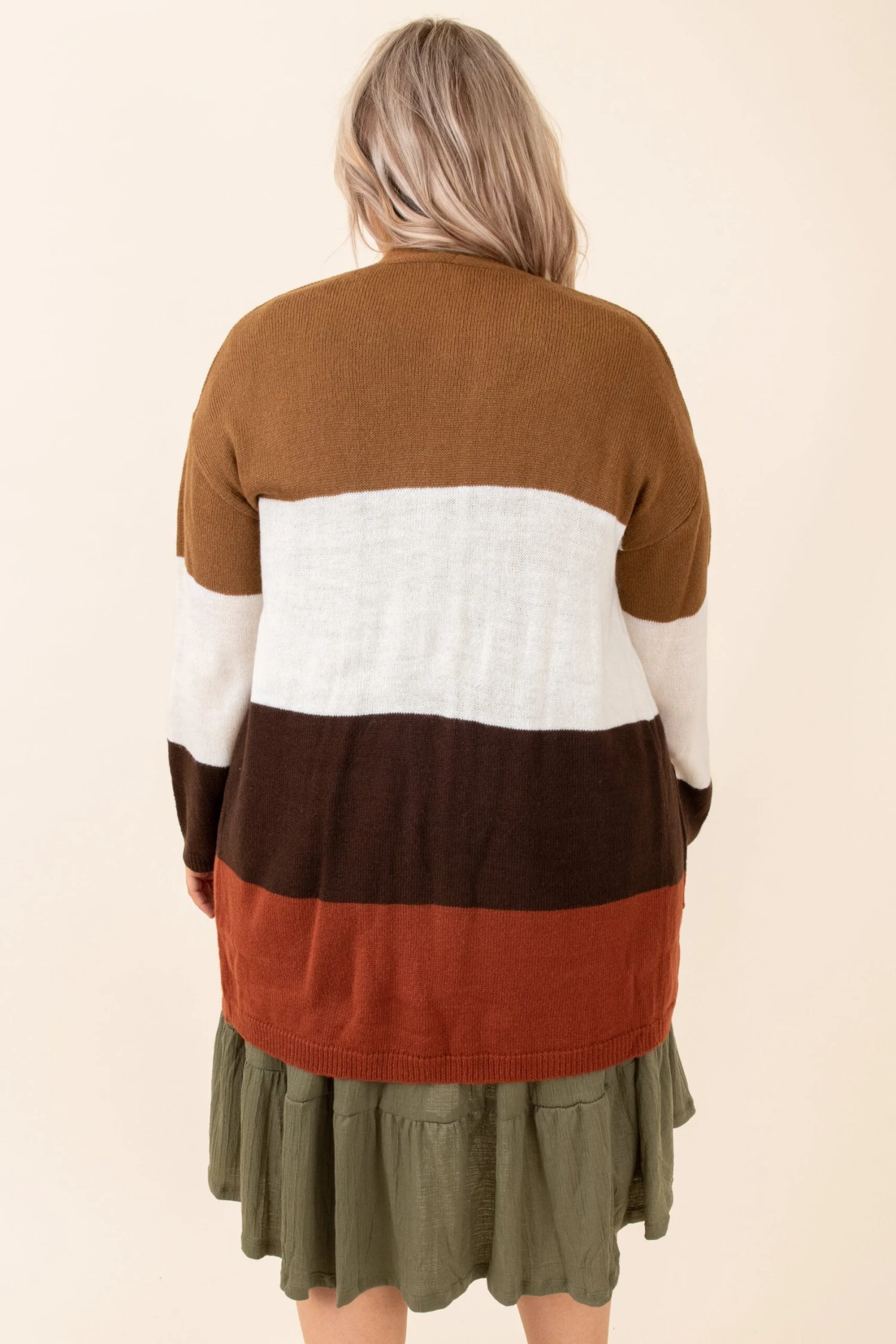 Keep warm and toasty all season in this cardigan! It has a chic rust color with fun color block detailing throughout! The thick material and pockets make it a go-to! So easily paired with distressed denim and booties for a chic fall look!