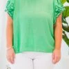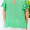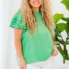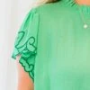 Stay on trend and in style with our Staying Consistent Top! Featuring embroidered floral flutter sleeves, this mint green colored top adds a touch of playful charm to any outfit! Keep your look fresh and fun with this must-have piece!