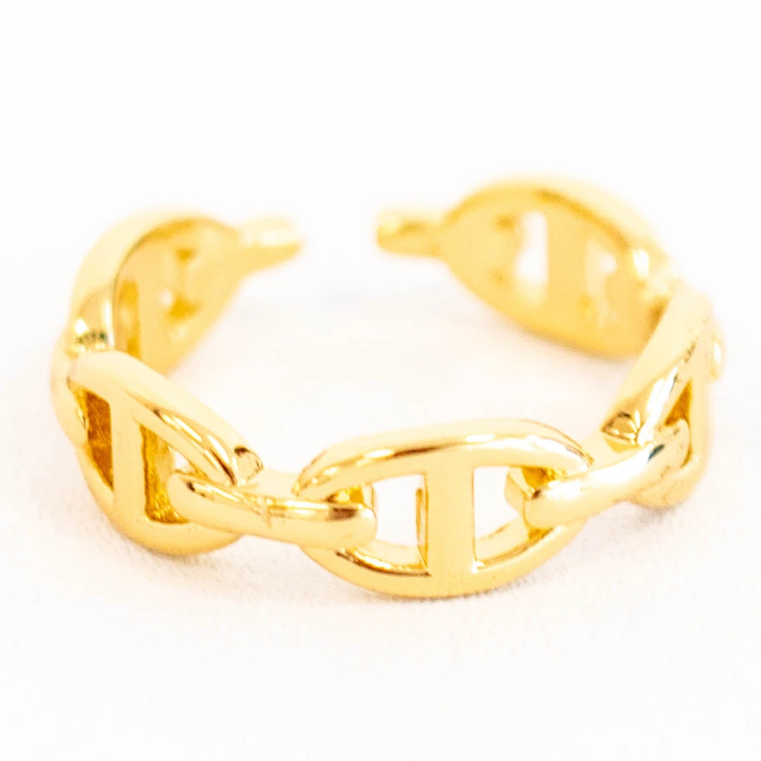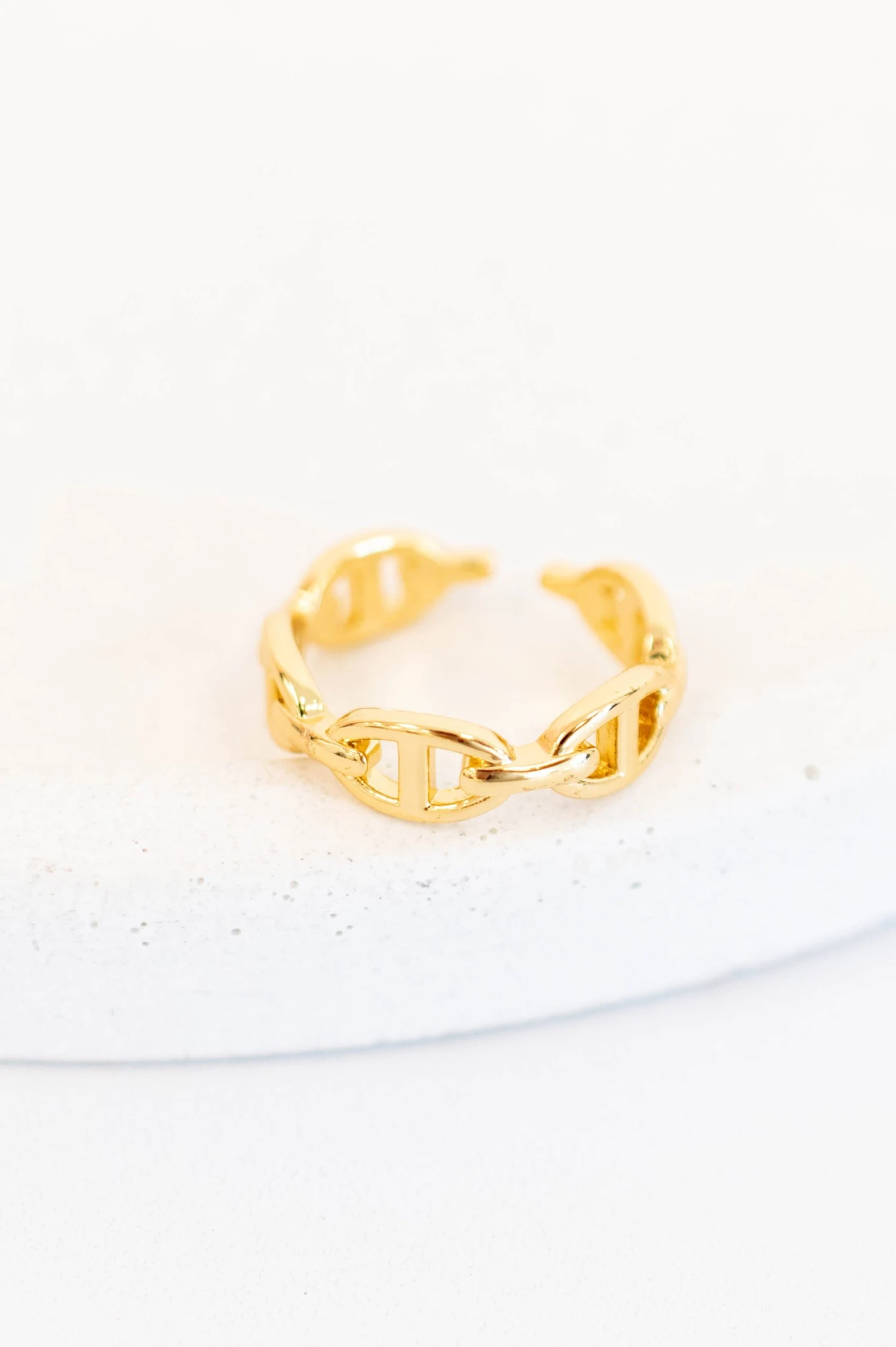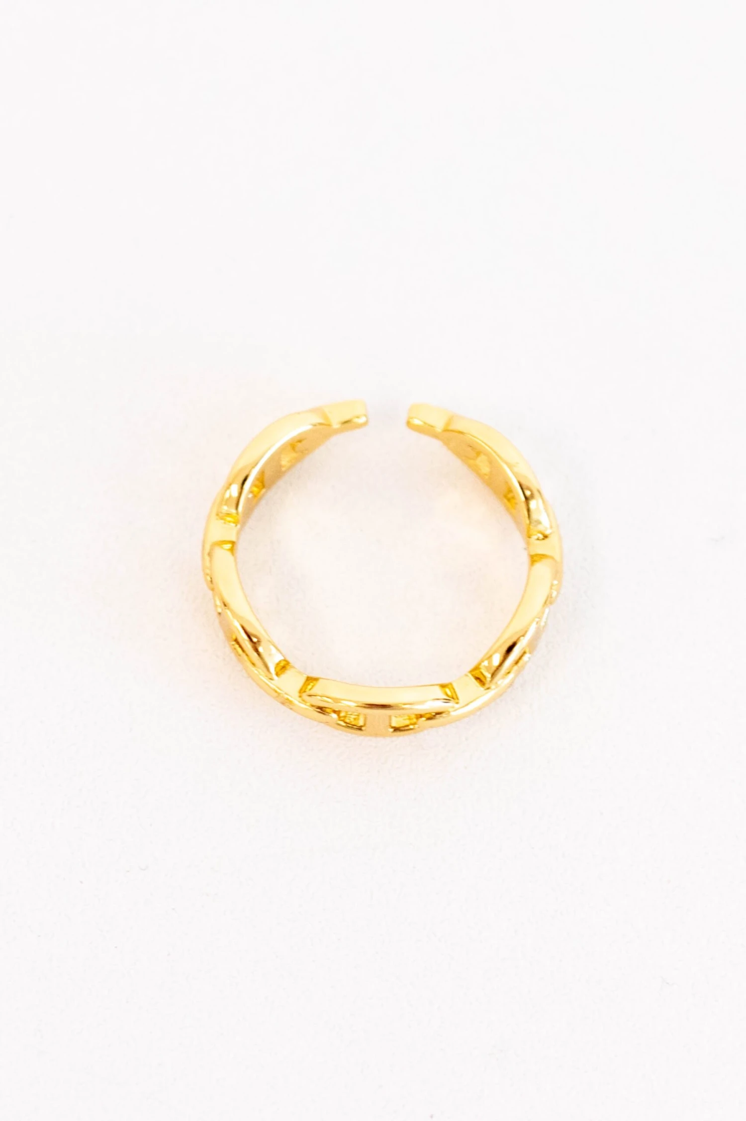 We are loving this amazing ring! This ring has a dazzling gold color with a link design that is so unique and adorable! You can adjust it to ensure the perfect fit! Style this ring with all of your favorite outfits for a elegant look this season!