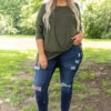 This cute tunic has stolen our hearts! It has a deep olive color, a dreamy soft fabric, and an oversized fit you will love! Oh and that little knot detail is SO trendy! Wear it casual with skinnies and slides or dress it up with a statement necklace, skinnies, and wedges!