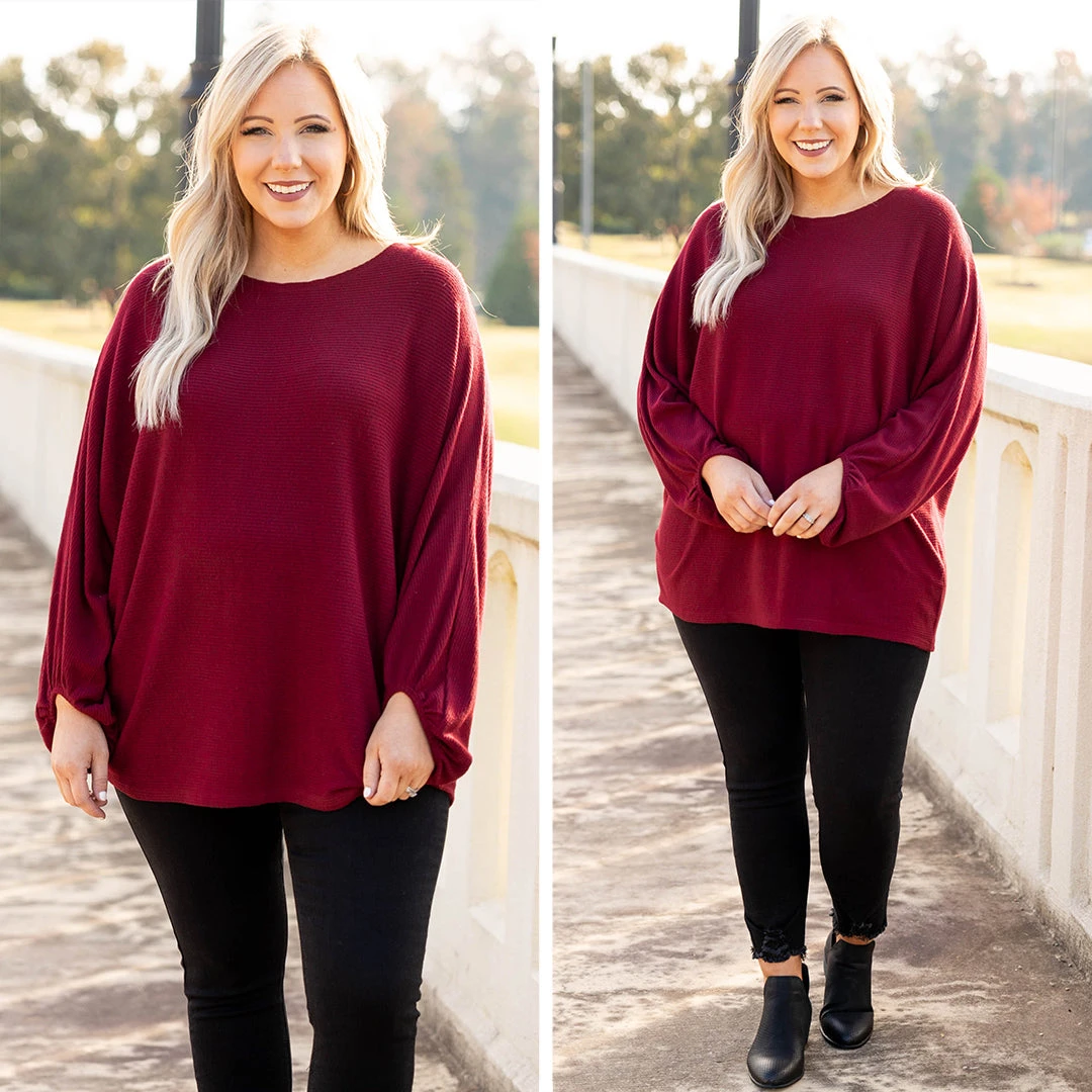 This tunic is the one that you need to add to your lineup! It has a super relaxed, oversized fit and a dreamy soft, ribbed fabric! We love the chic ruby color and how easy it is to wear casual or dressed up! Pair it with leggings and sneakers for a chill day or dress it up with a statement necklace and skinnies for a night out!