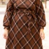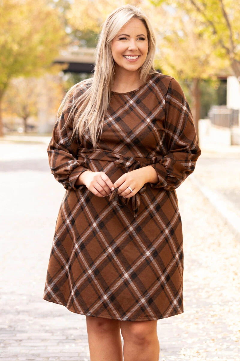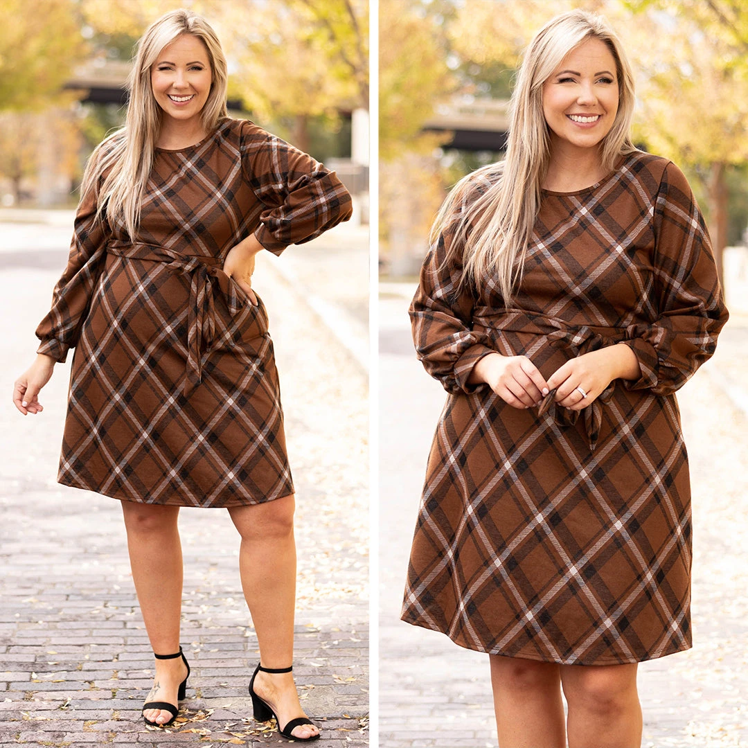 Feel free to strut it in this new fab dress! It has a great length, a tie at the waist and a cool brown and black plaid print. Pair this cutie with heels and cute accessories for a perfectly chic look this season!