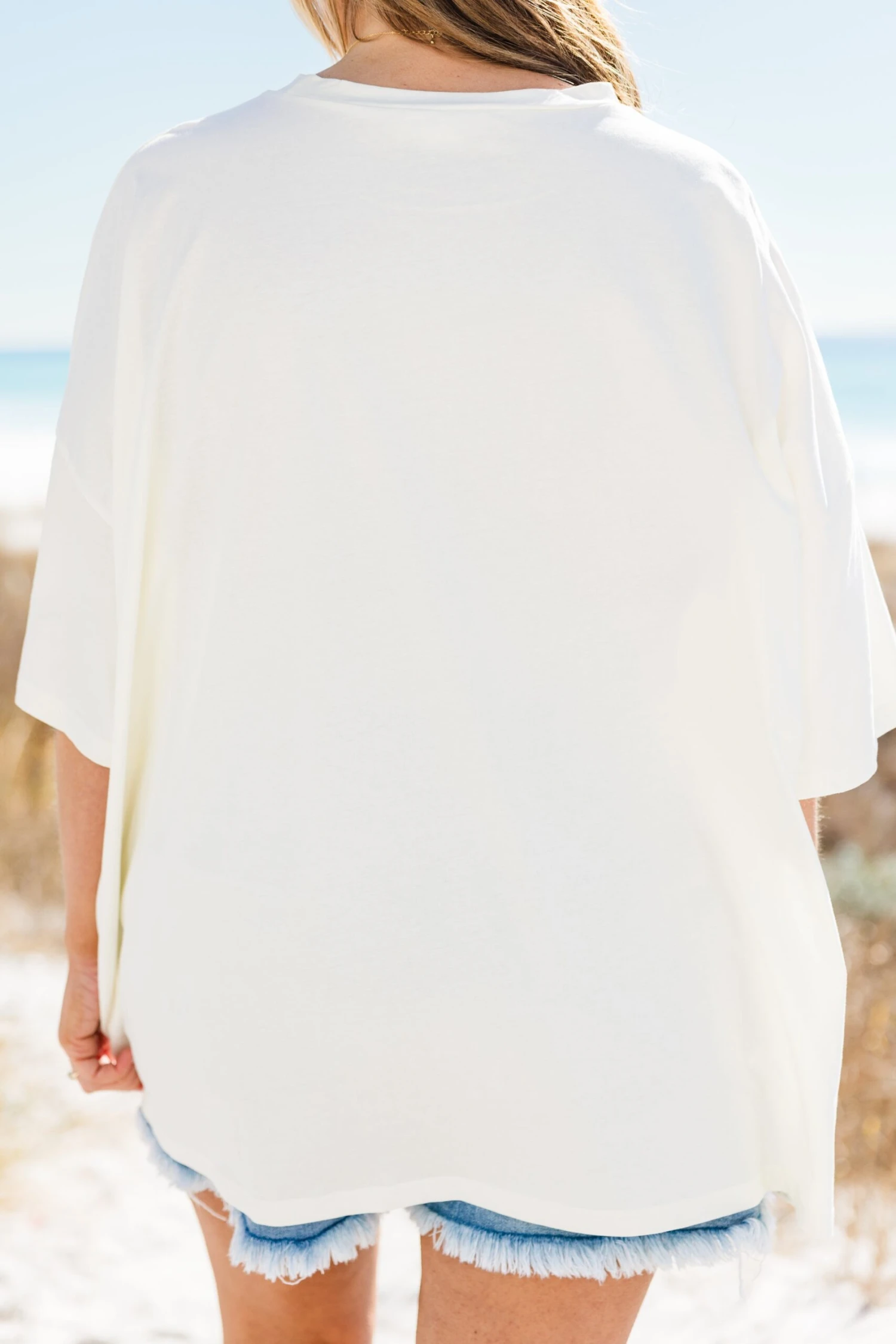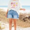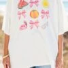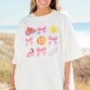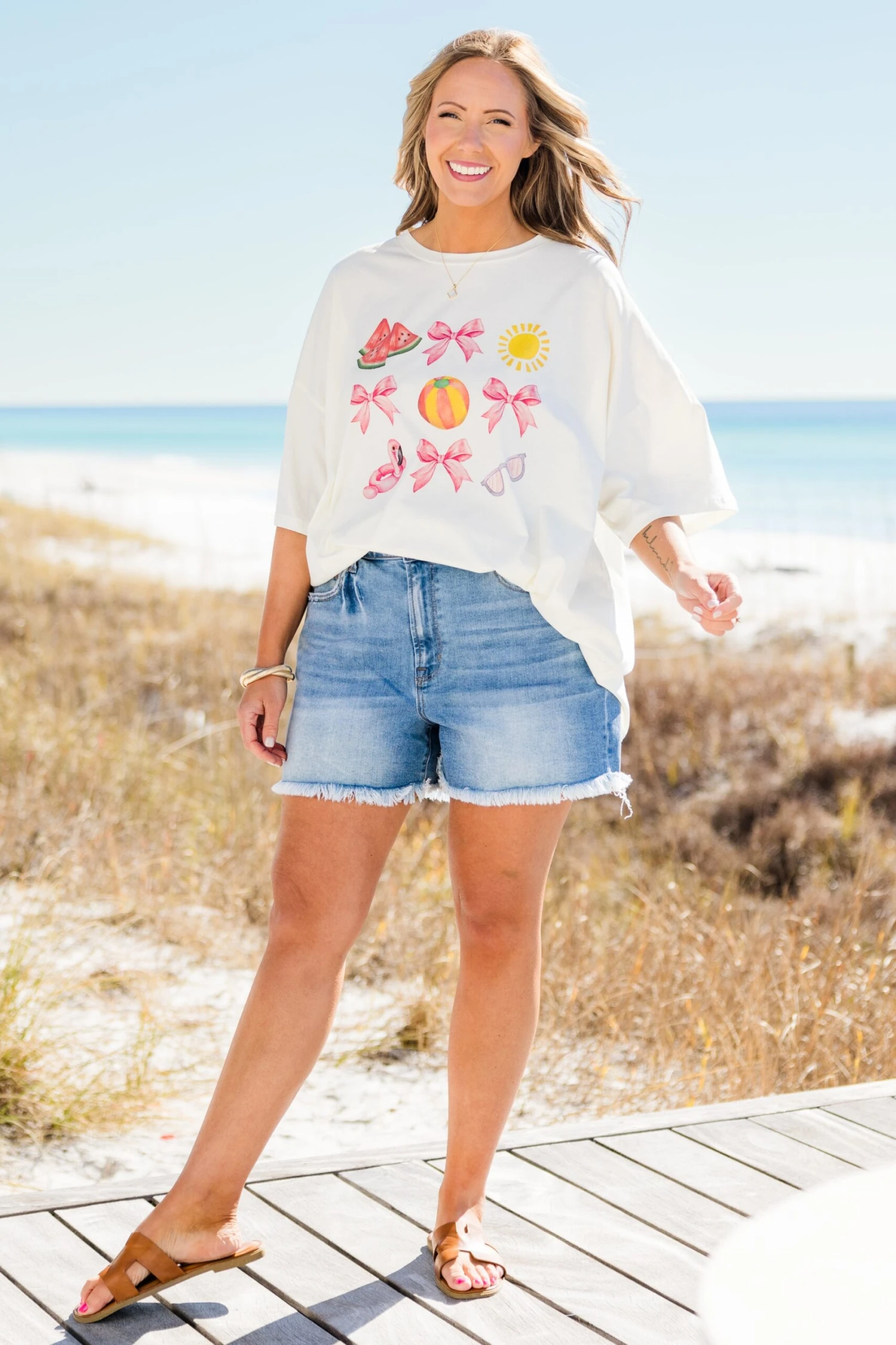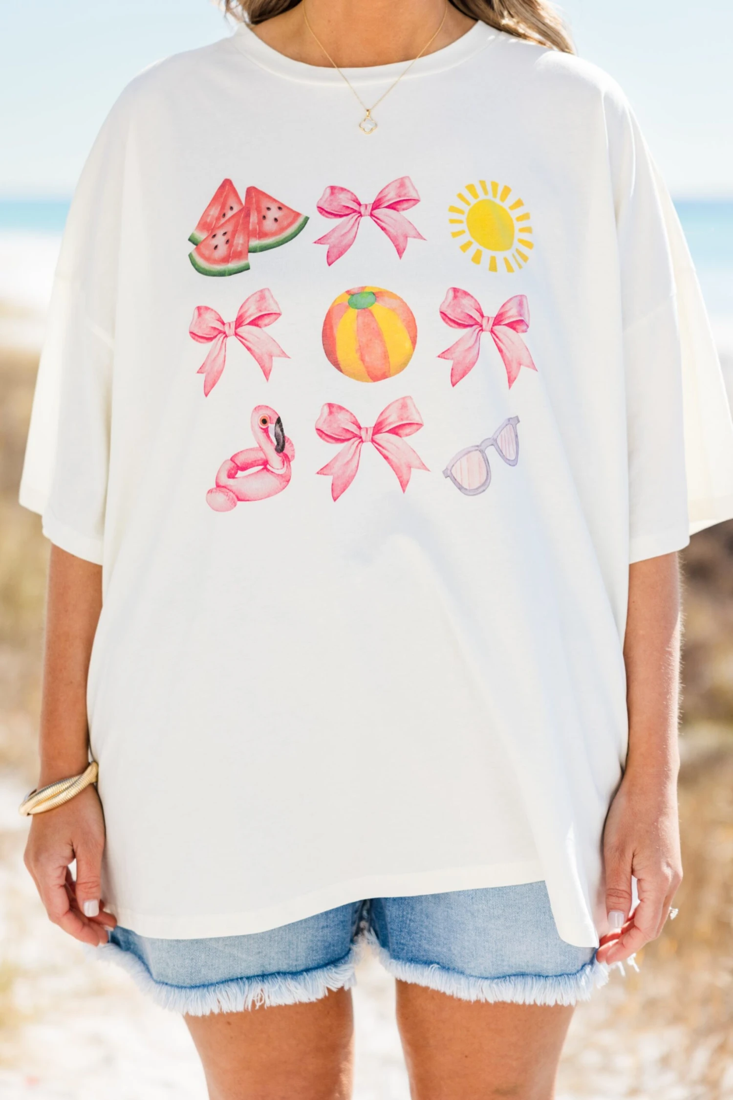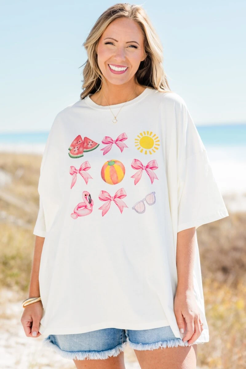 Get ready for summer with our Summer Faves Boyfriend Tee in ivory! This oversized tee features an array of bows and summertime essentials, so you can look cute and stylish while staying comfortable! Perfect for a day at the beach or a casual summer outing!