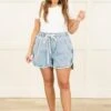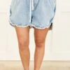 Spring into the new season with these FAB shorts! These have a light wash color, a elastic waistband, adjustable drawstring and trendy fraying on the hem to have you walking in style! Style them with a cute tank and some sandals for a classic chic look!