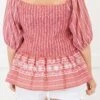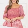 Unleash your inner serenity with this playful top in vibrant red! Featuring a smocked bodice, elastic puff sleeves, and eyelet detailing, this babydoll peplum silhouette brings out the best in you! Say goodbye to boring tops and hello to a fun and flirty look!