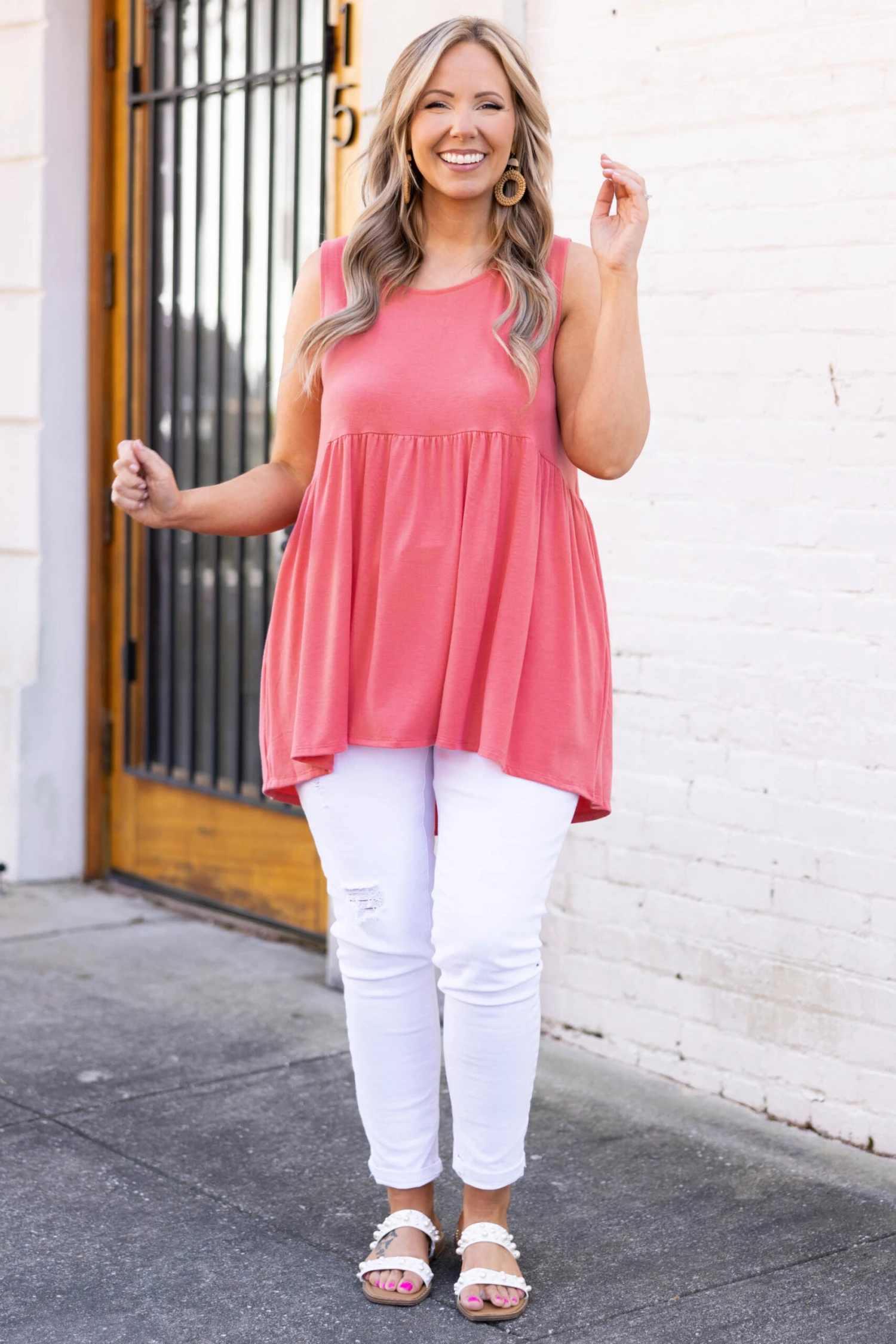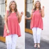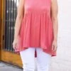 Put this top on and get yourself to a summer soiree! The deep coral color is bold and beautiful and the babydoll style will look good on everyone! Style this with some white denim and sandals for a chic look!