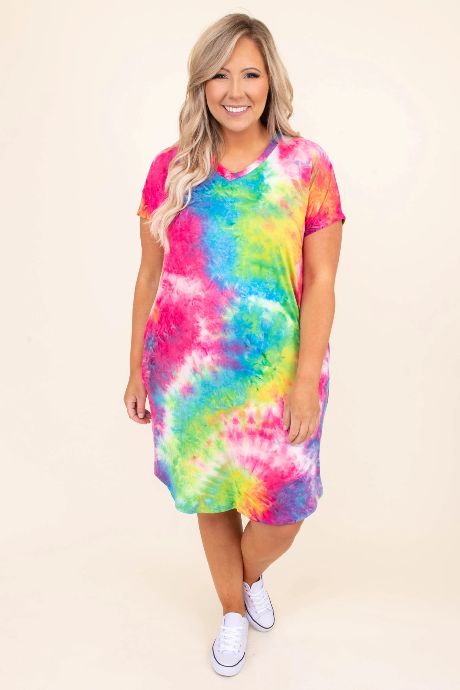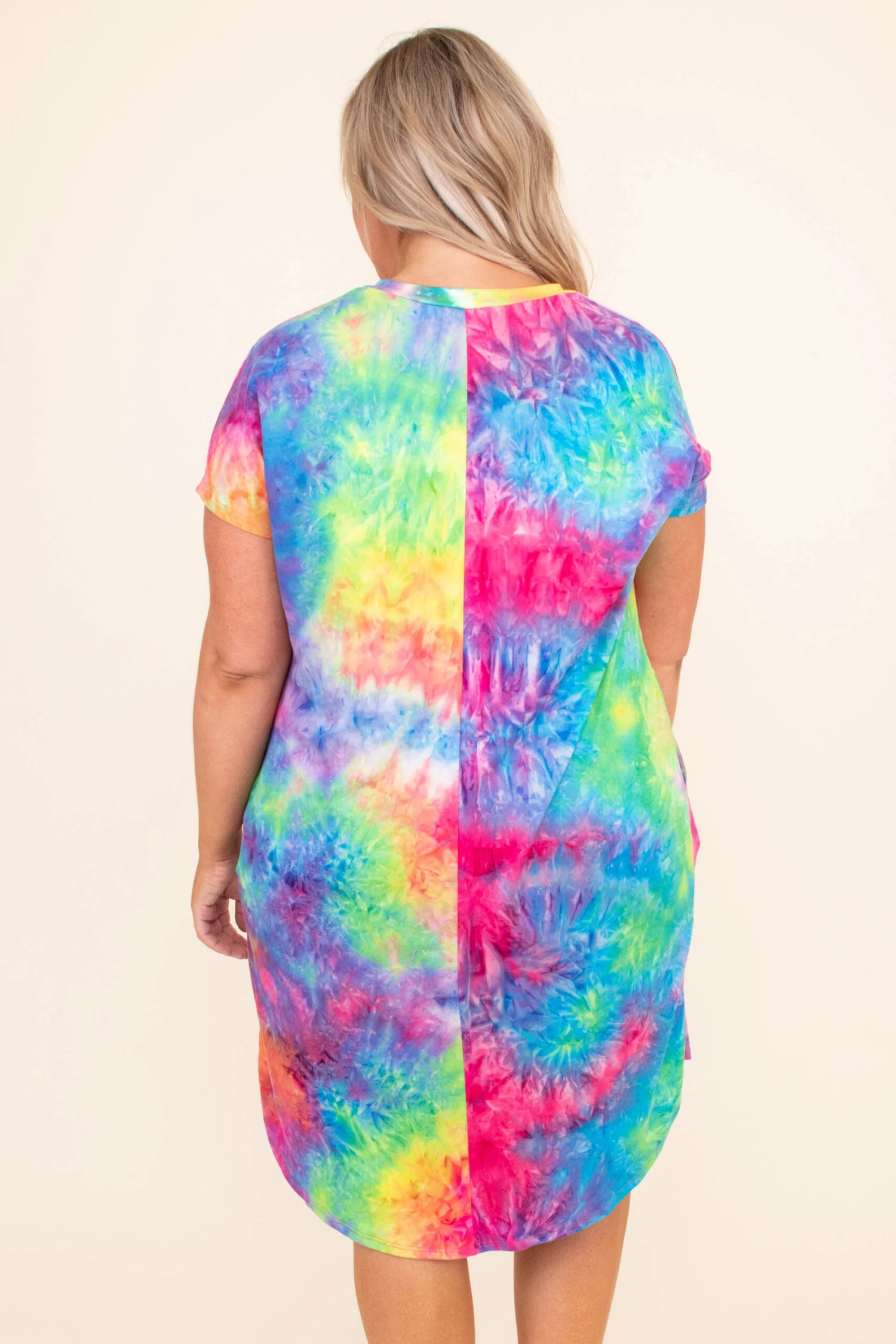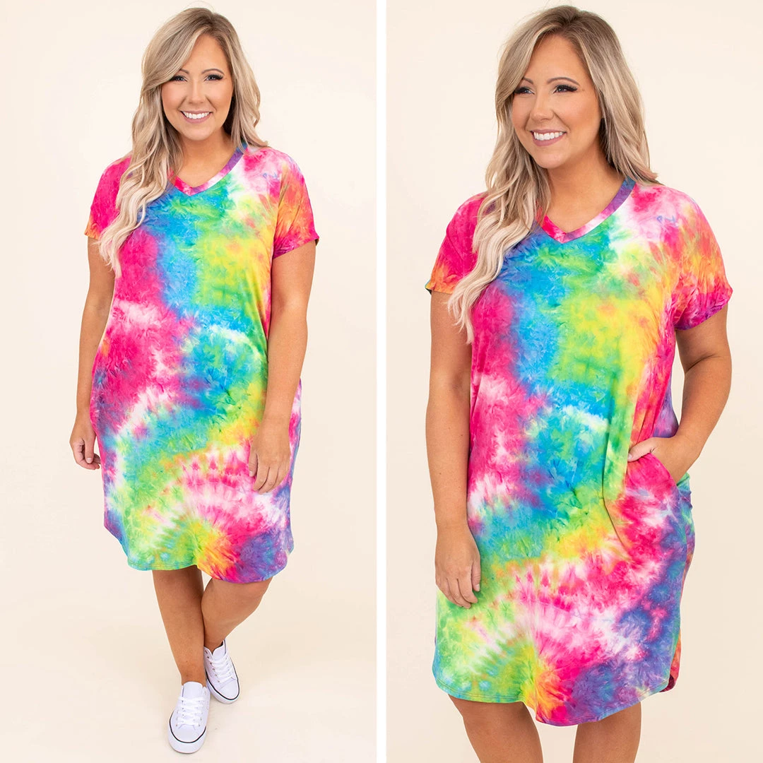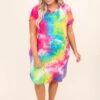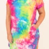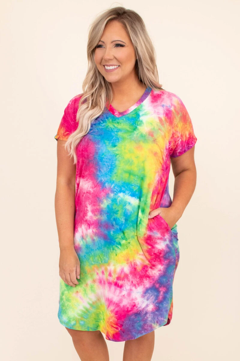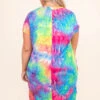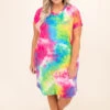 This dress is too much fun for Summer! It has a trendy tie dye pattern with bright colors that are perfect for the season! It’s comfortable for all day wear, has a flowy fit, and can be styled with your favorite shoes and accessories! Pair this dress with sneakers and wedges for an effortlessly chic look!Â