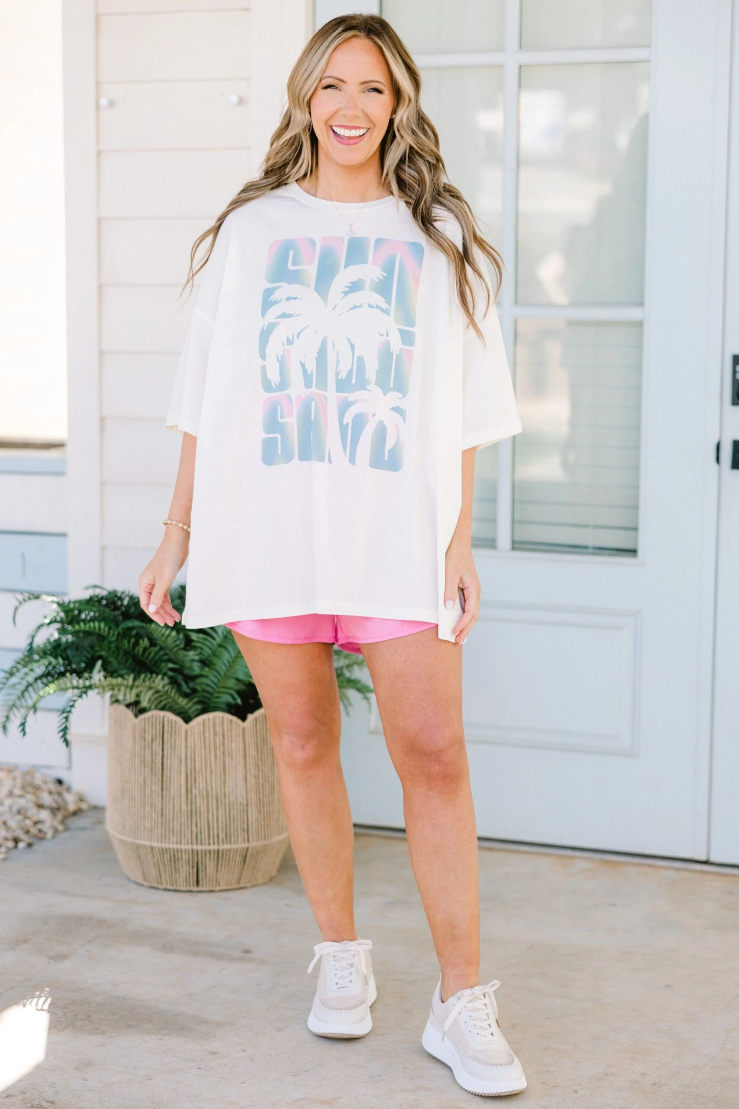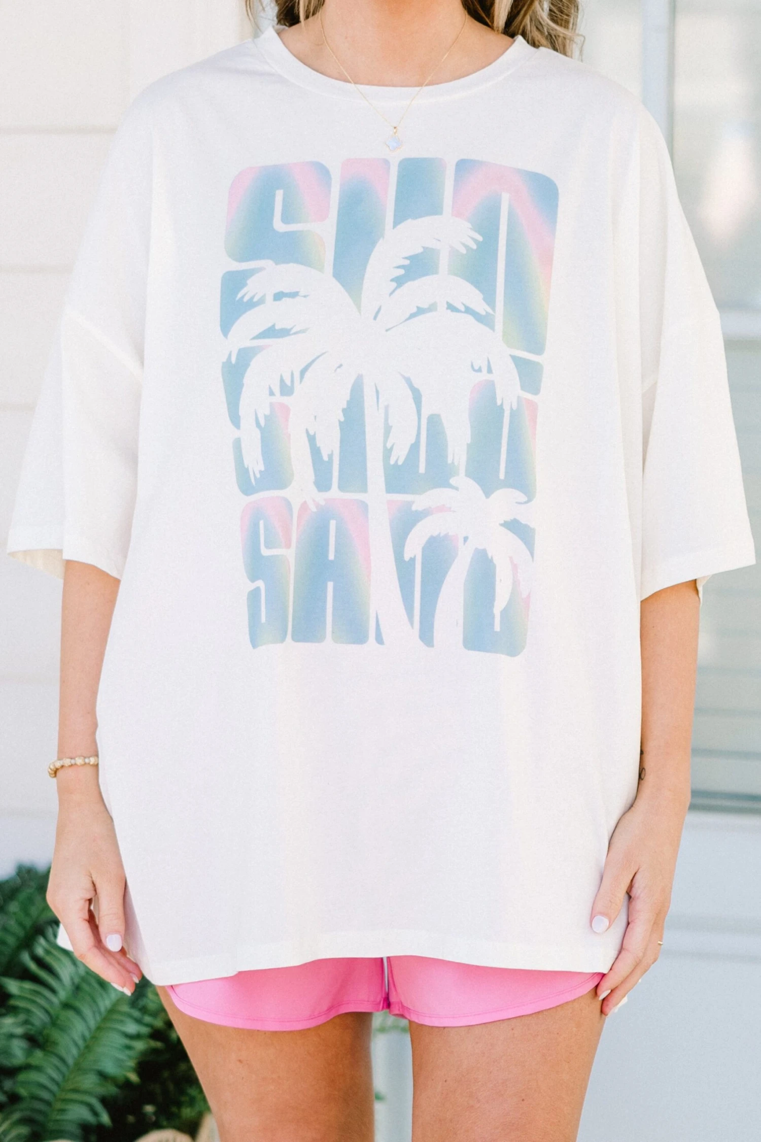 Feel the warmth of the sun, the salt in the air, and the sand between your toes with this boyfriend tee! This oversized tee features trendy tie dye lettering and a palm tree design, making it the perfect addition to your summer wardrobe! Stay comfortable and stylish all season long!
