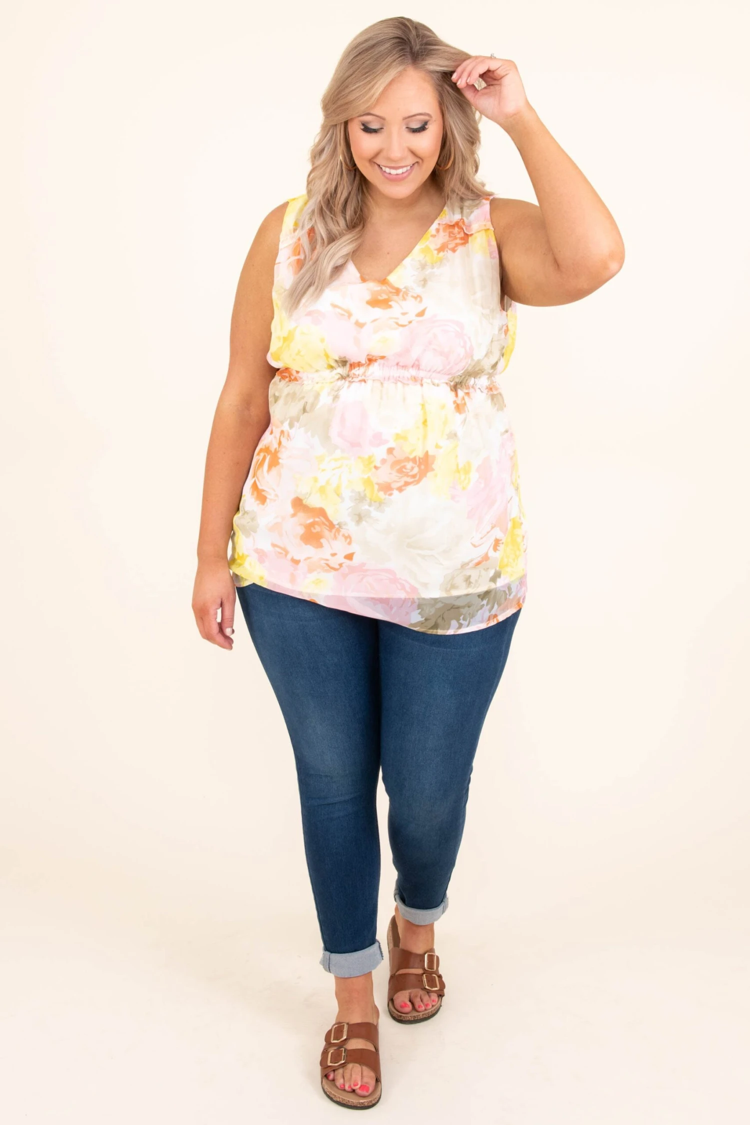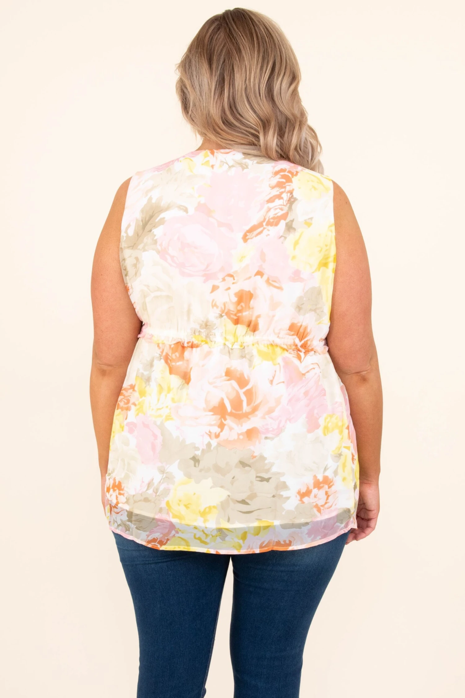Get out and feel a sweet sunlight breeze in this top! The large floral pattern is so dreamy and the v-neck and cinched waist are so flirty! Pair this cutie with some skinny jeans and sandals for an easy but stylish look!