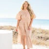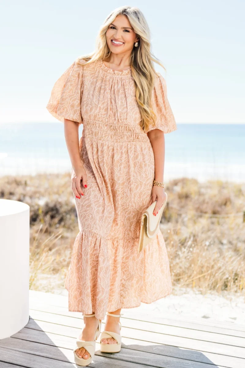 Elevate your summer wardrobe with the Sunlit Stroll Maxi Dress in taupe! This dress features a rounded neckline and smocked waist for a flattering fit, along with elastic puff sleeves for added style and comfort! Perfect for a day out under the sun or a romantic evening stroll!