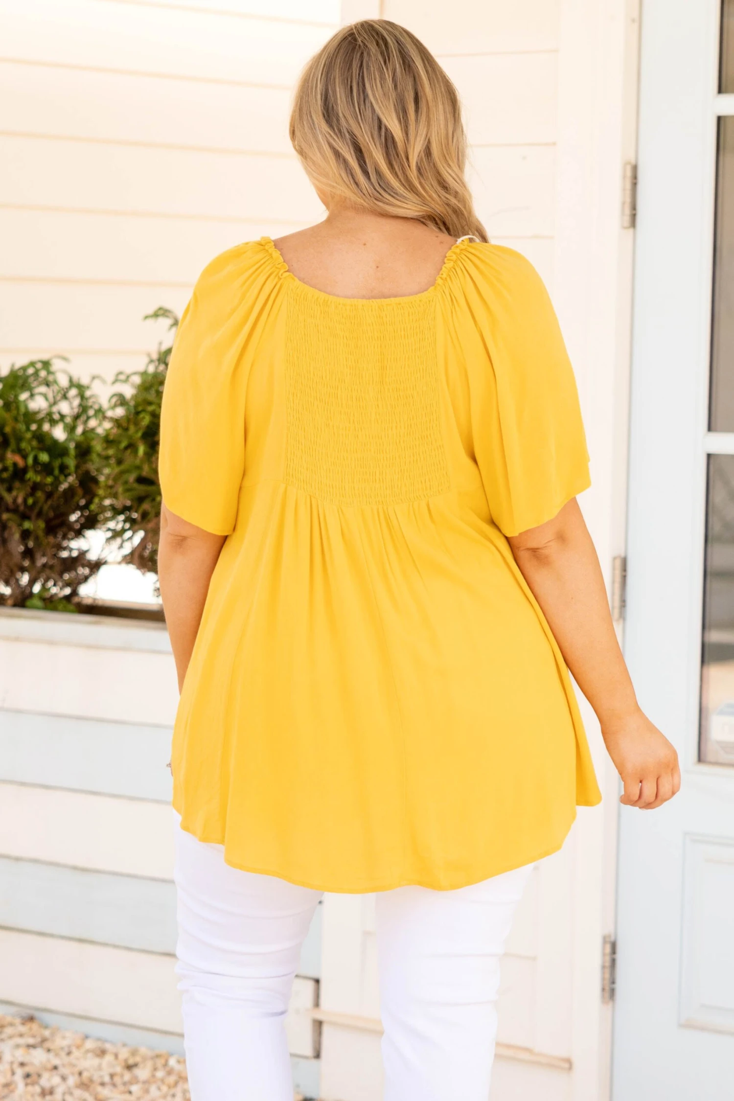 This top is so cute, we can’t get over it! The yellow color is so fab and the empire waist babydoll style is so cute! Style this with white skinnies and heels for the perfect look!