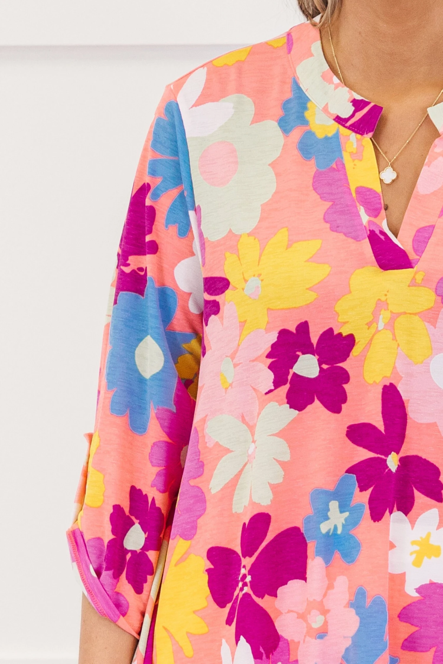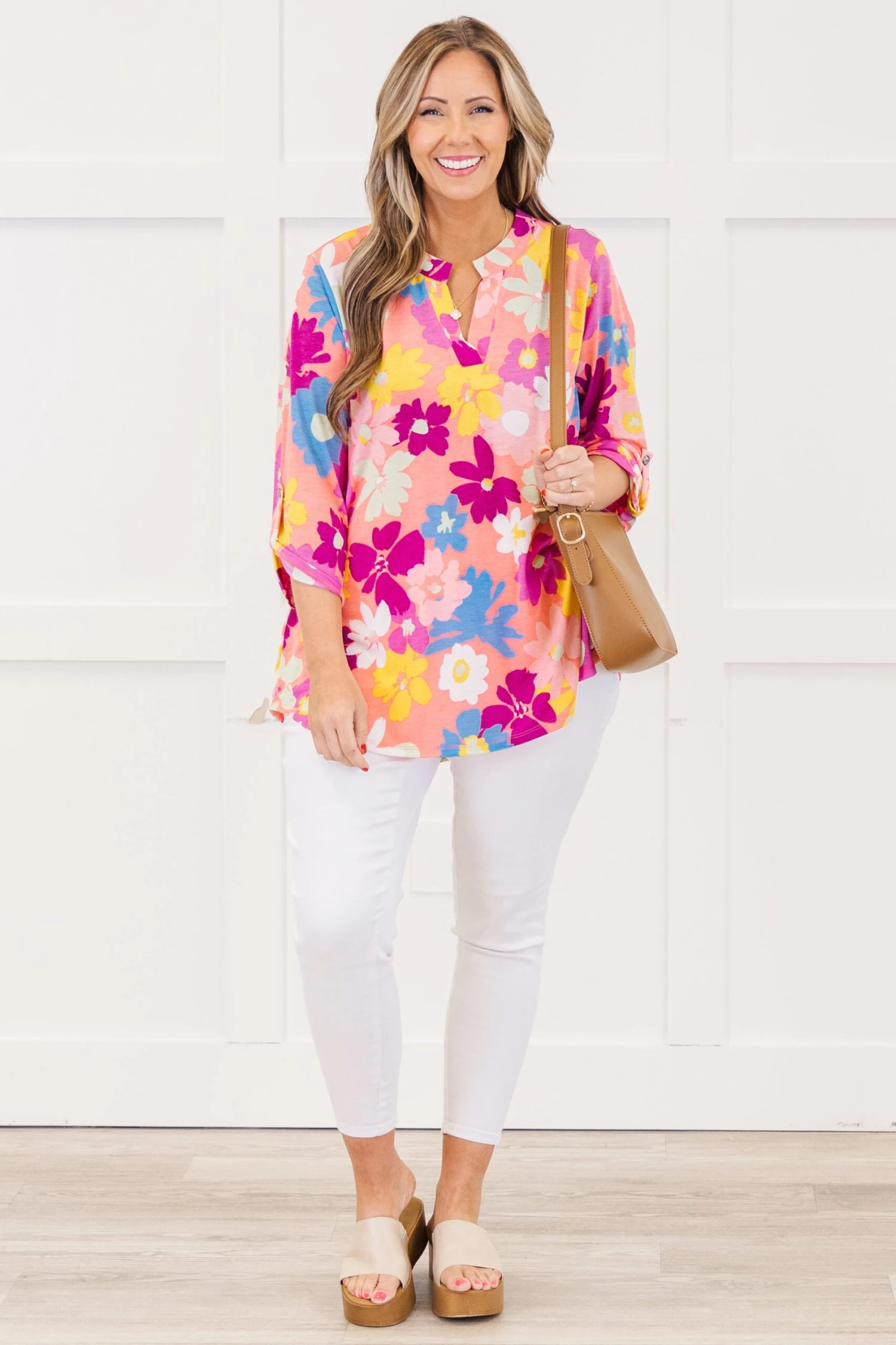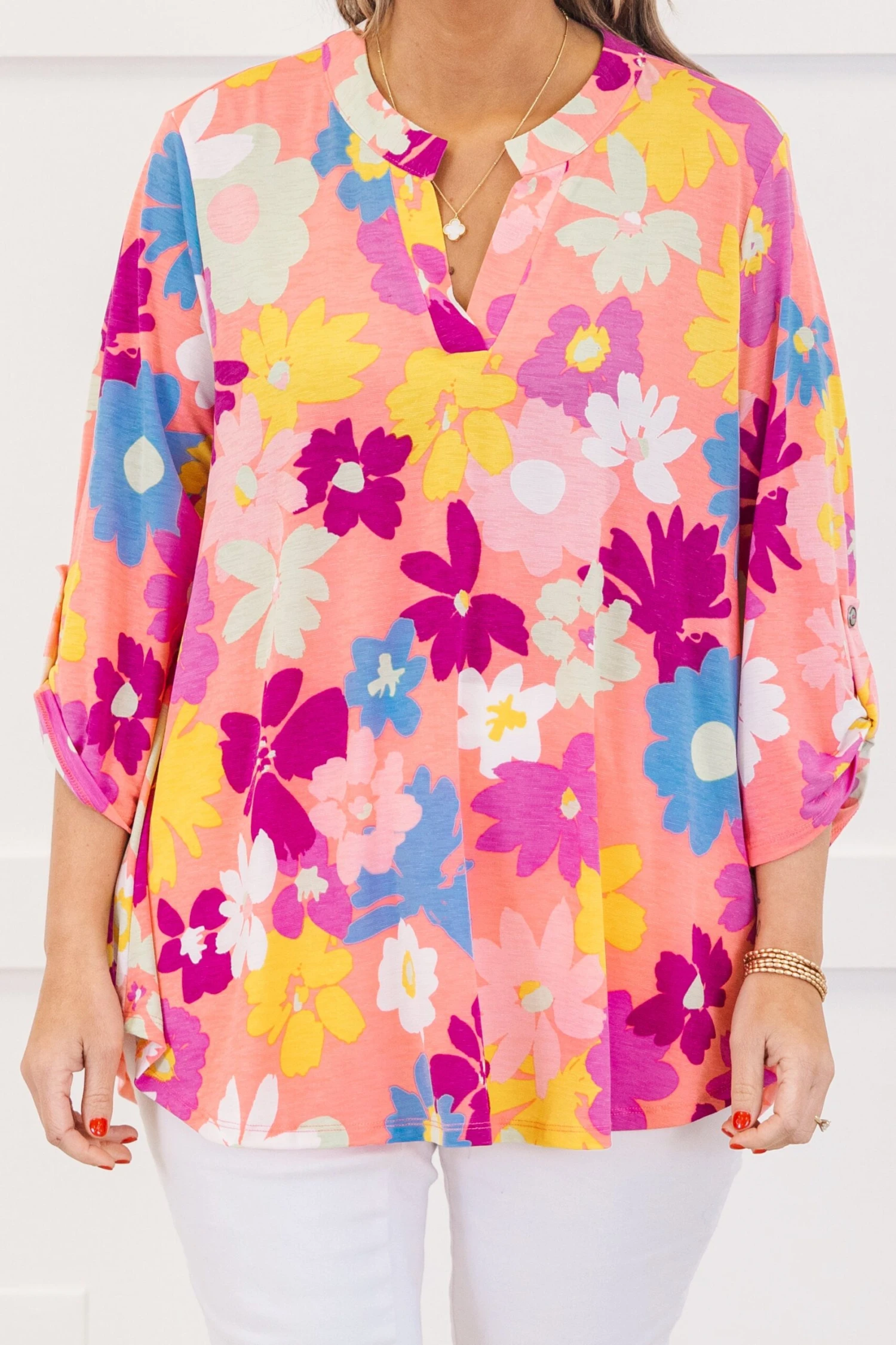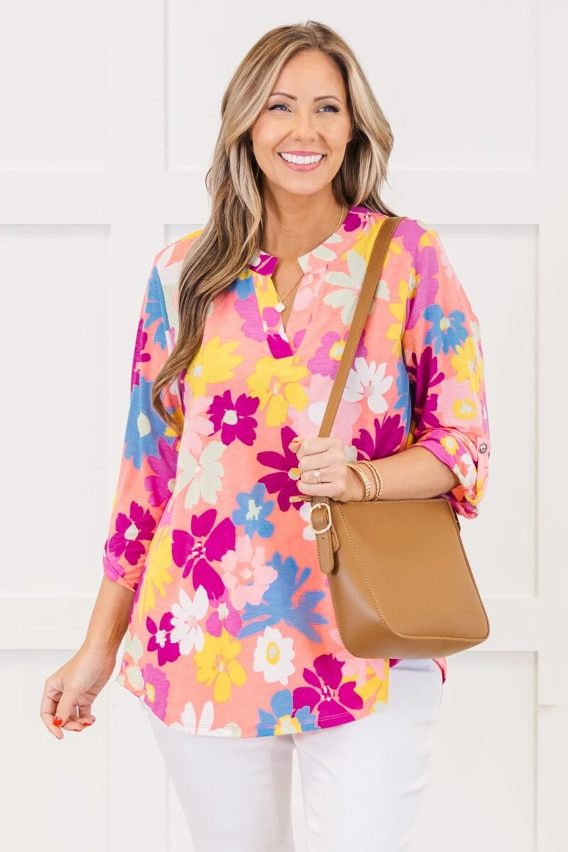 Introducing the Sunshine In The Garden Top! Embrace effortless style with our wrinkle-free, easy care design – perfect for all-day wear! The gorgeous coral color and playful pattern add a touch of sass to your wardrobe! Mix and match with your favorite pieces for a timeless and chic look!