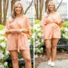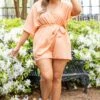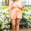 This romper is SUPER cute! It has a pretty peach color with a flirty crisscross neckline that is just in time for the season! The sassy, figure flattering fit is just what you need for your next event! Pair this cutie with some heels or sneakers for the ultimate chic look!