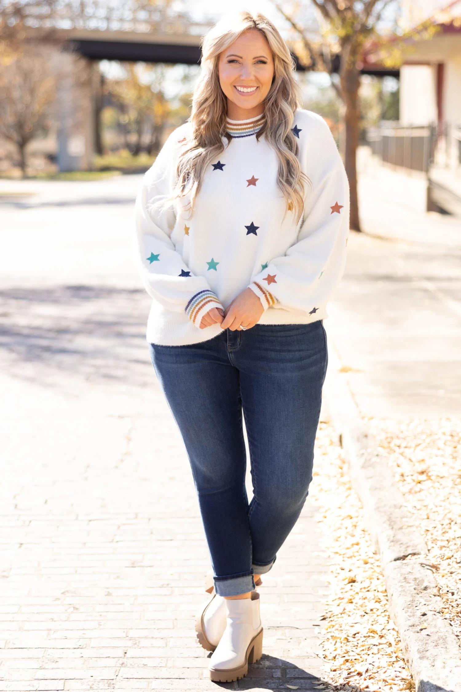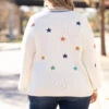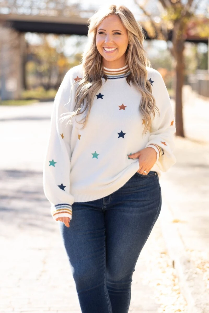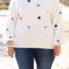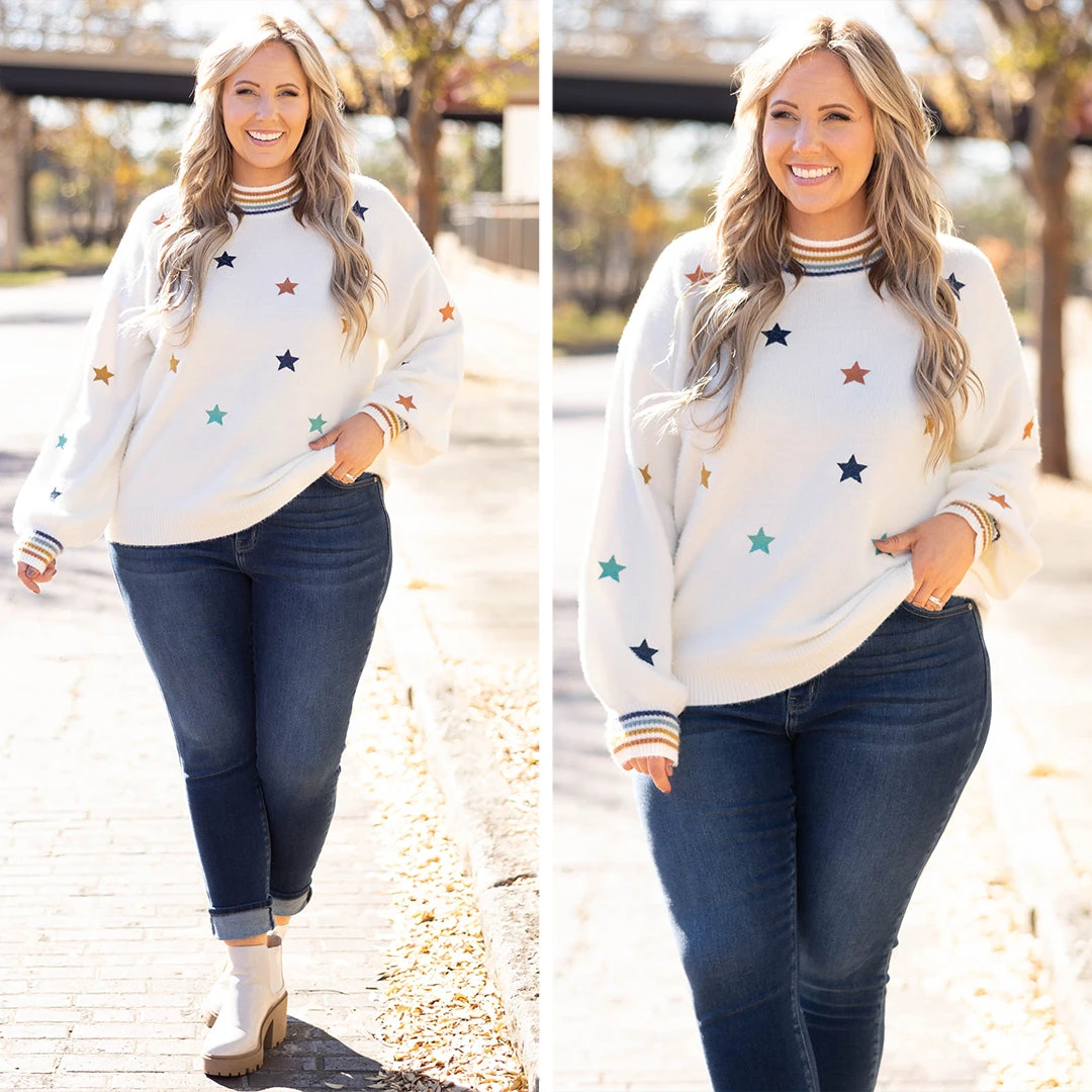 You’ll be the star of the show in this gorgeous sweater! This sweater has a lovely white color with a star pattern that is colorful and sweet! The comfy, stretchy fit is perfect for the season! Style this sweatier with skinnies or leggings for a casual chic look!
