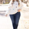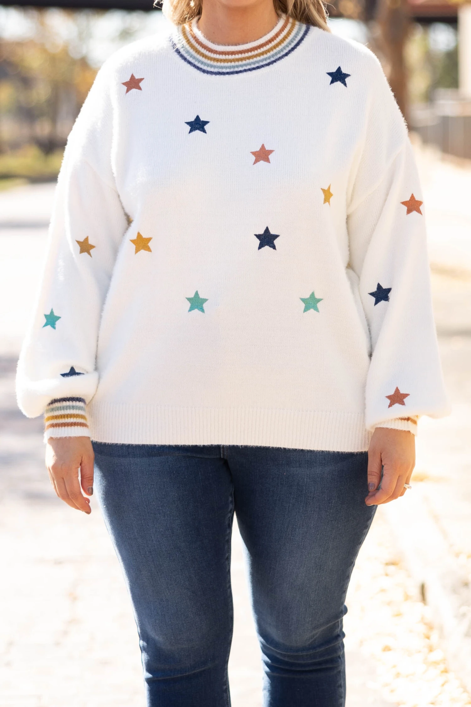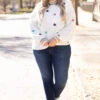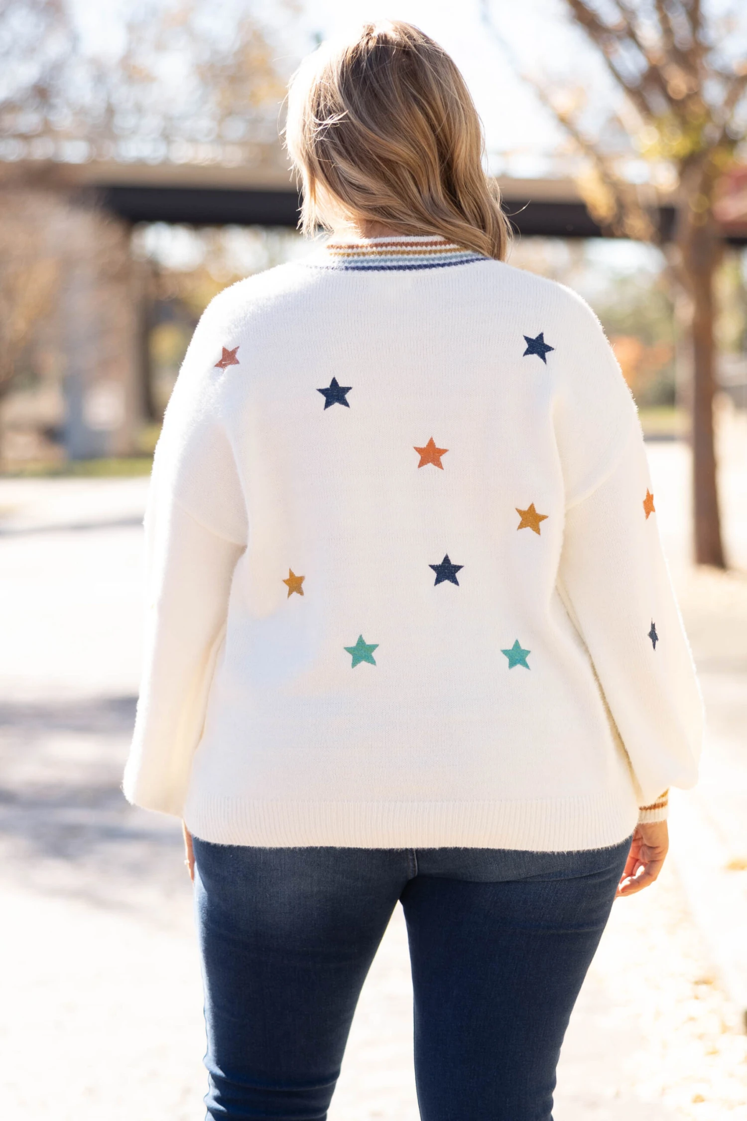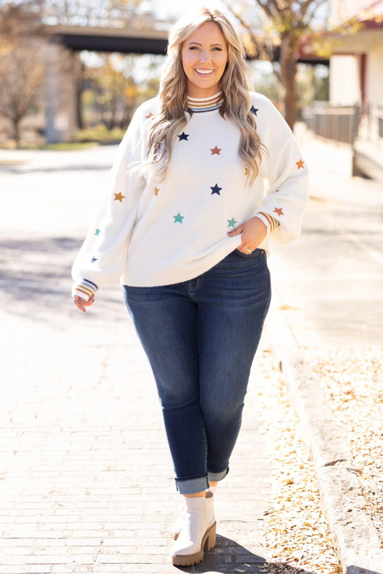 You’ll be the star of the show in this gorgeous sweater! This sweater has a lovely white color with a star pattern that is colorful and sweet! The comfy, stretchy fit is perfect for the season! Style this sweatier with skinnies or leggings for a casual chic look!