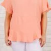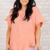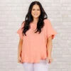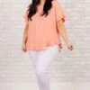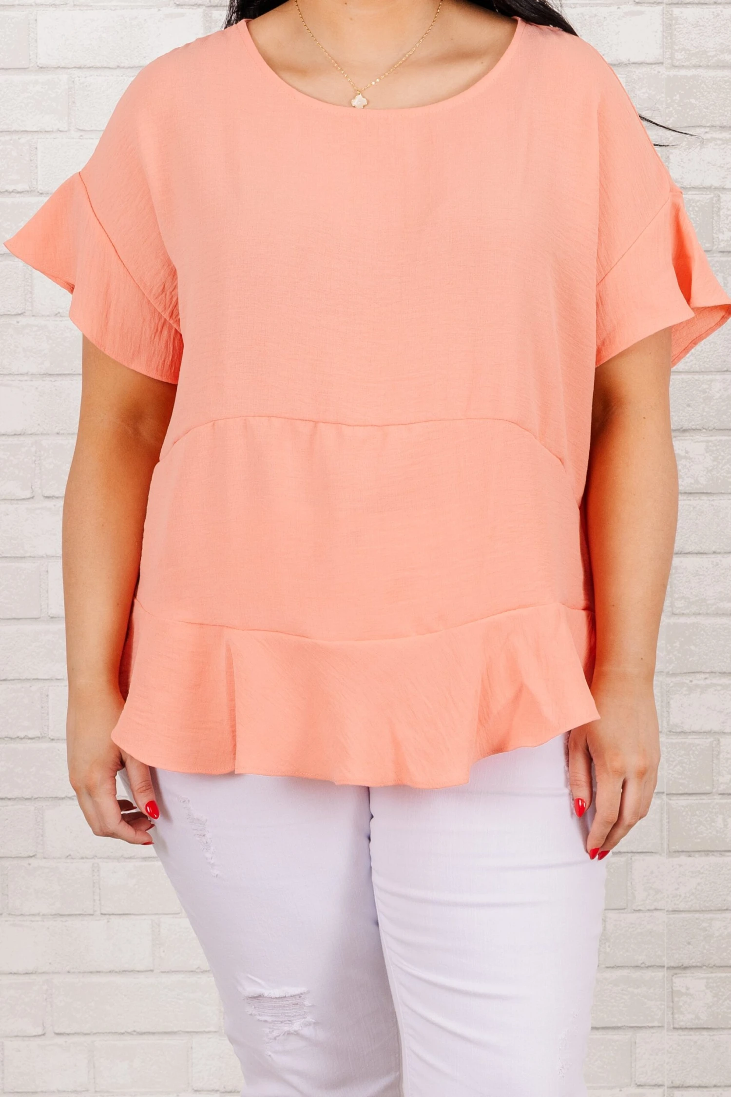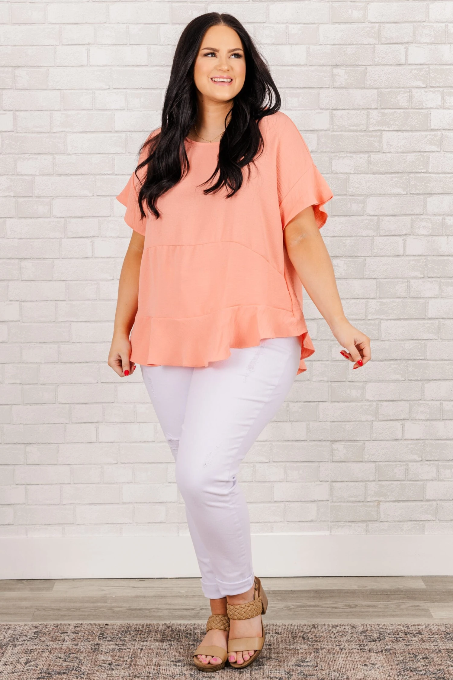 Sway this way and grab this cutie! This top has a gorgeous coral hue that is just in time for the season! Its feminine ruffle detailing adds a playful touch to this perfect day out piece! Stay stylish and comfortable in this must-have top1
