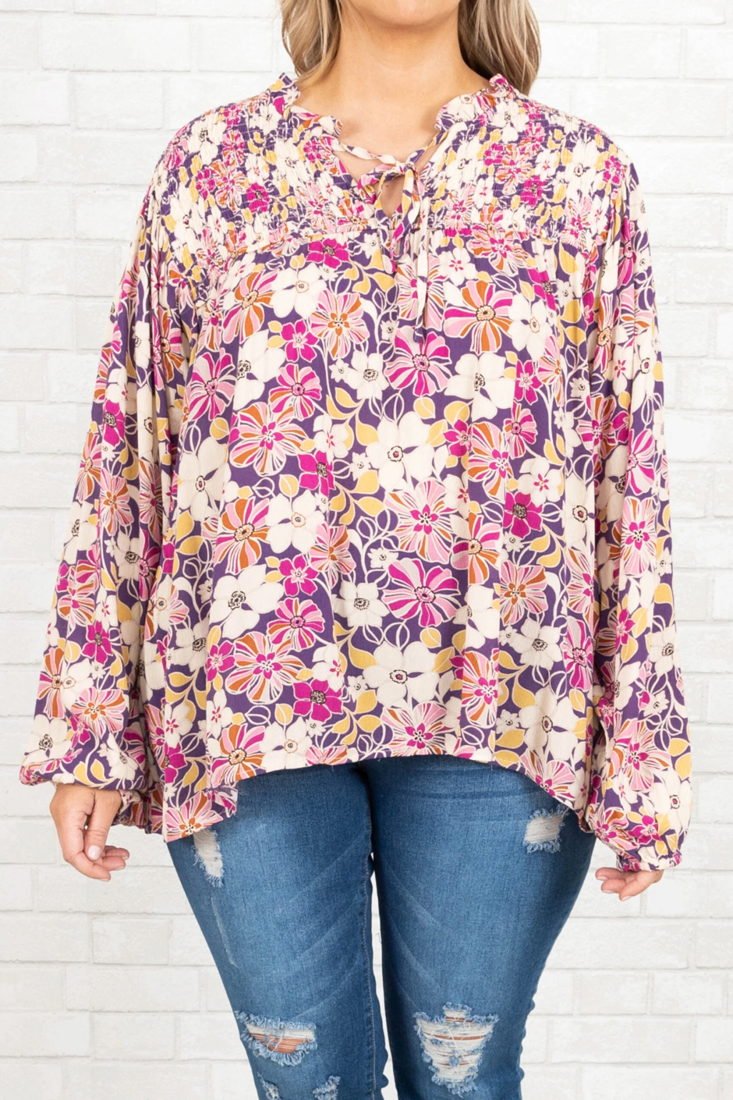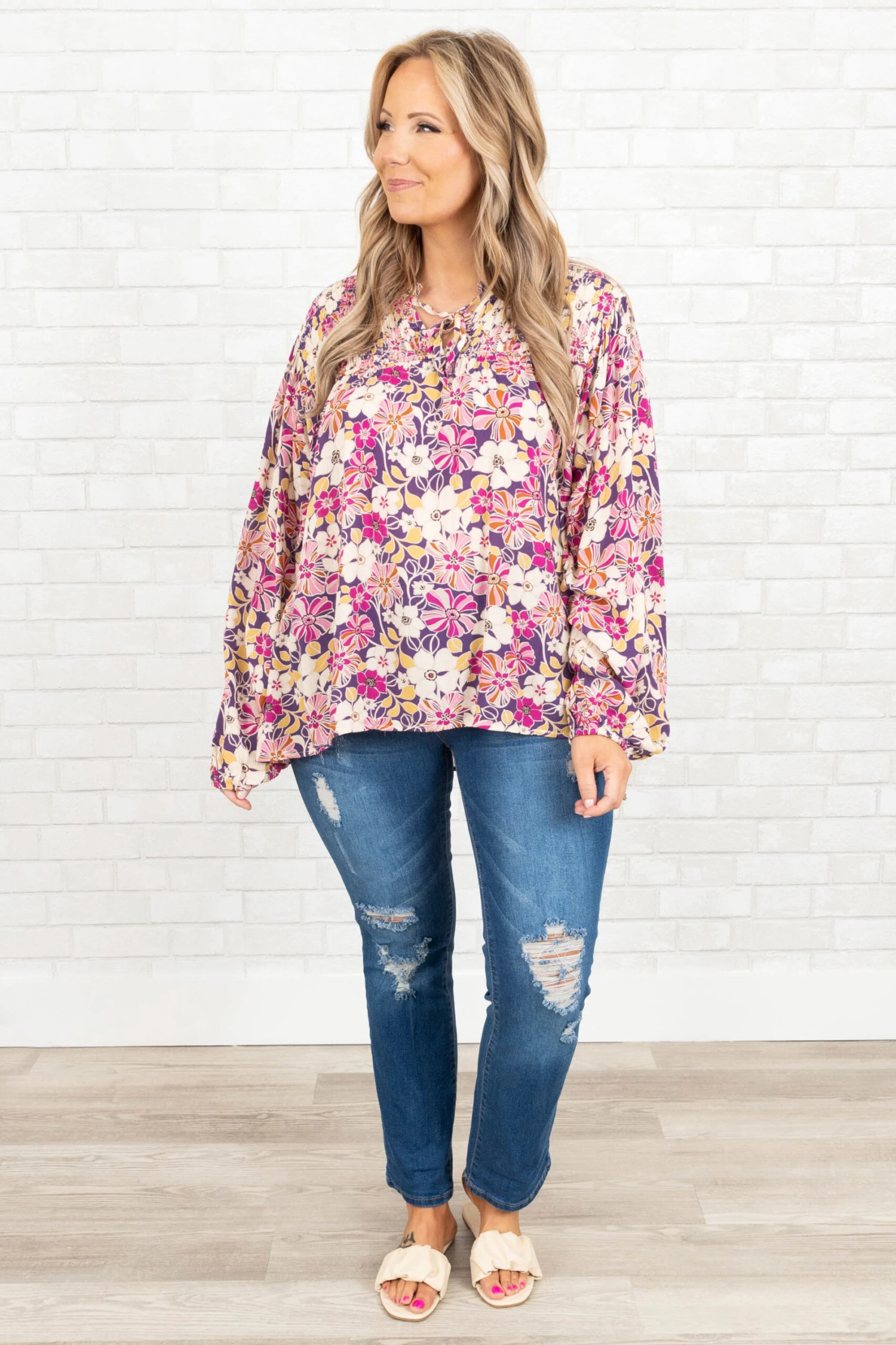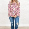 Sweetie, you need this top in your wardrobe for the season! The bold violet color and floral pattern is the perfect combo for your new favorite top! Style this top with some distressed denim and sandals or wedges for a classic chic look!