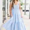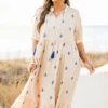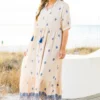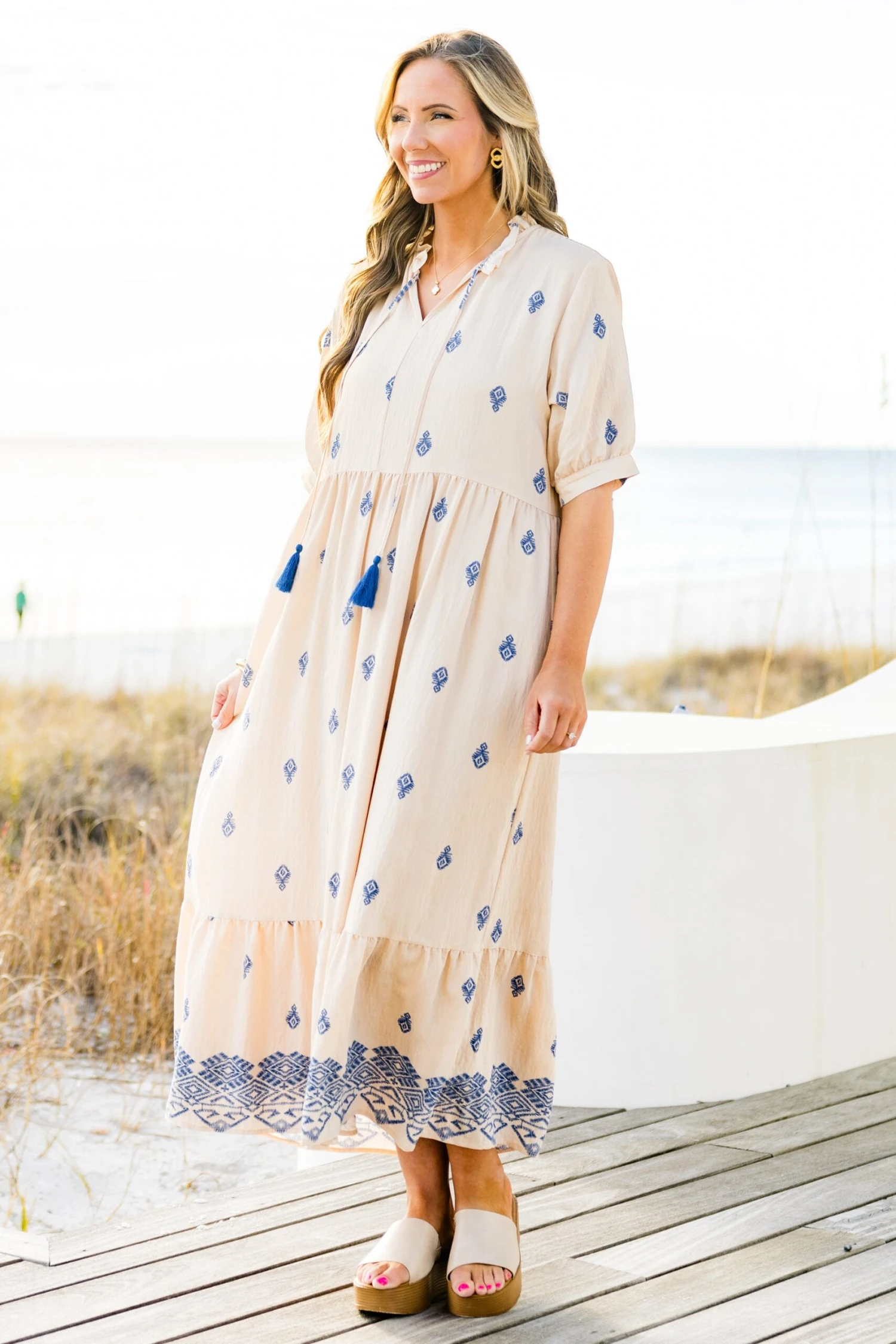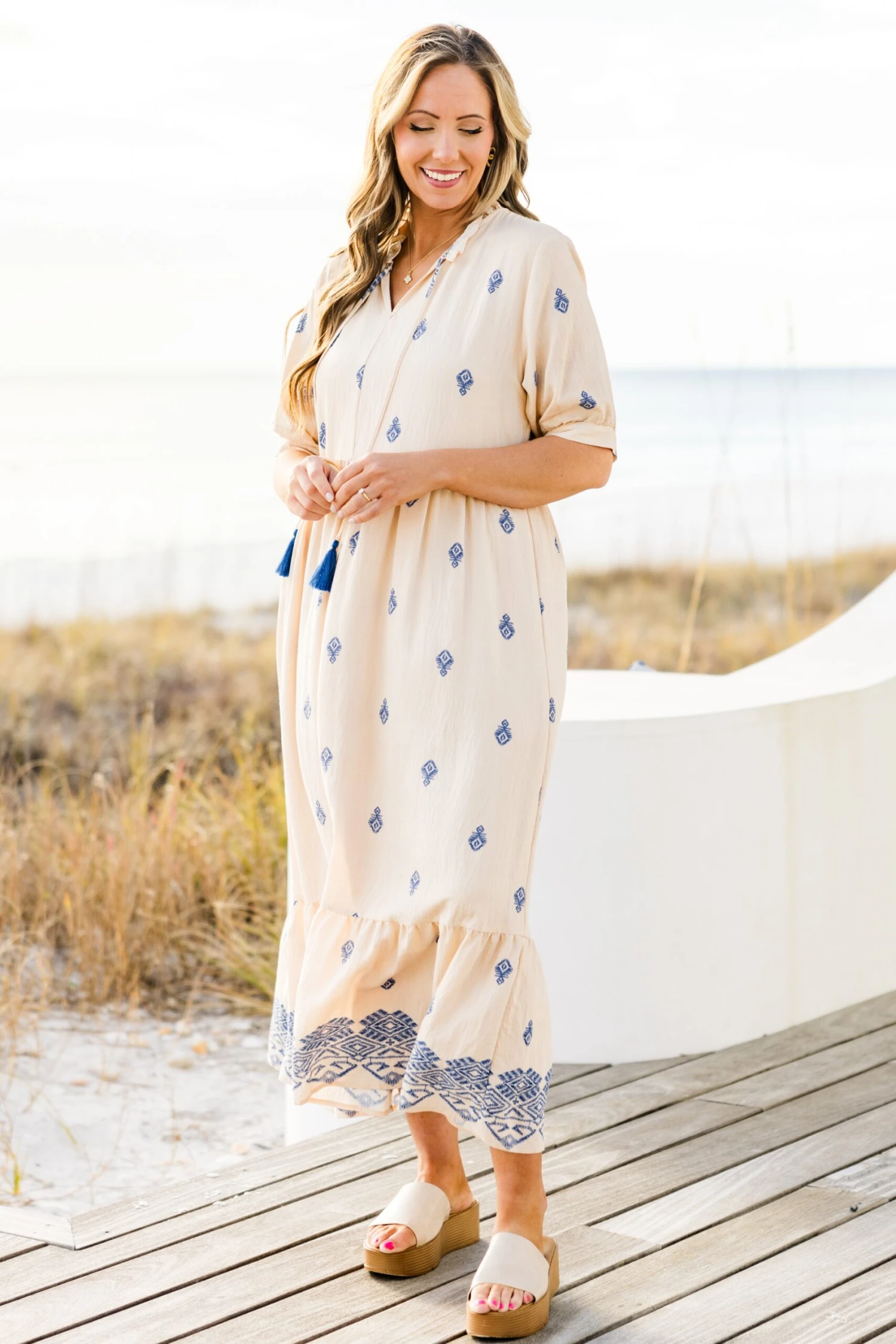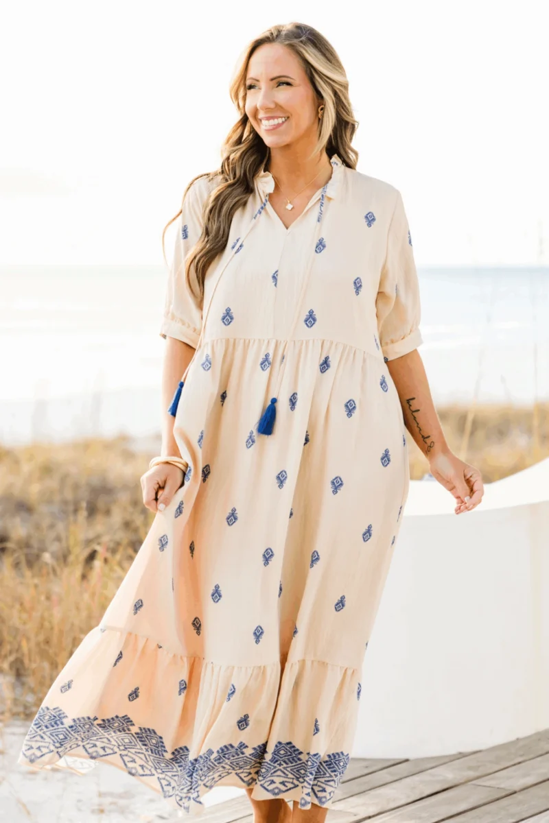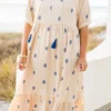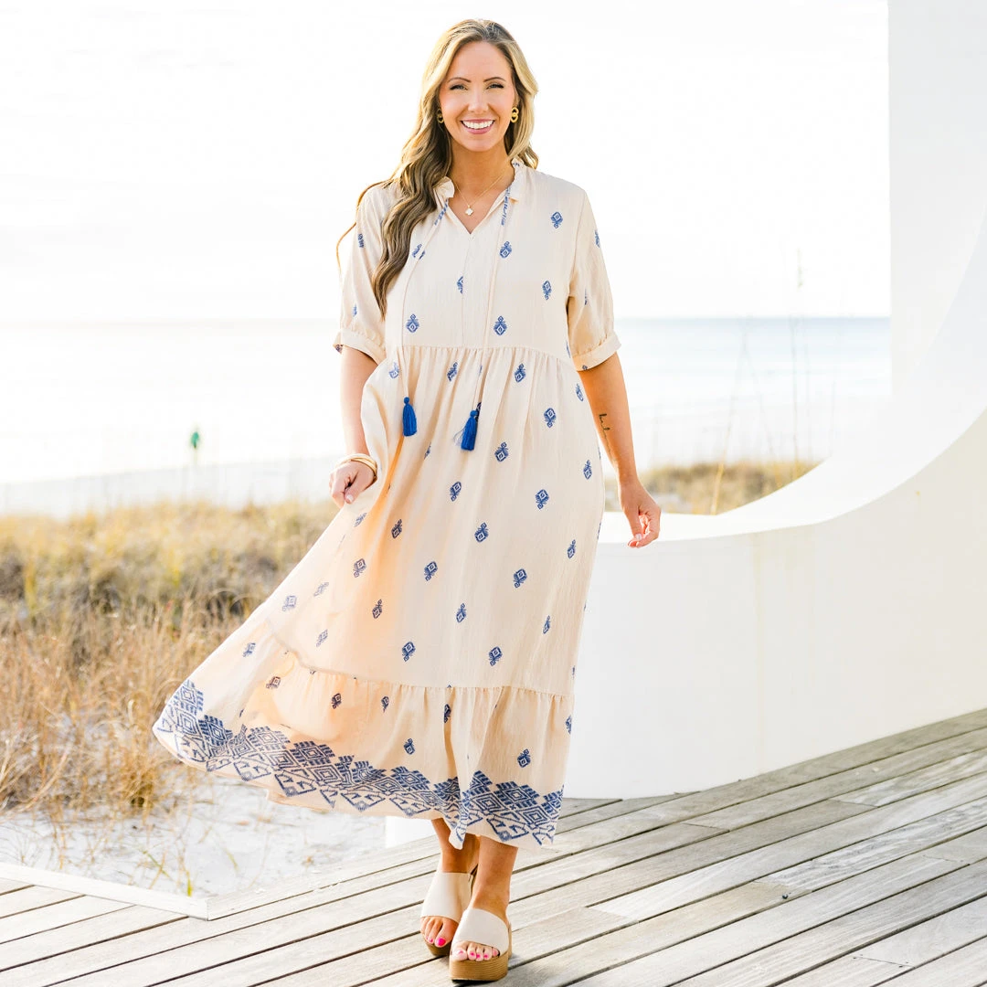Introducing our Sweet As Can Be Dress in beautiful blue! Featuring delicate tassels and a sophisticated damask print, this dress is perfect for any occasion! The flattering v-neck adds a touch of elegance, making you look and feel your best! Embrace your style with this stunning dress!