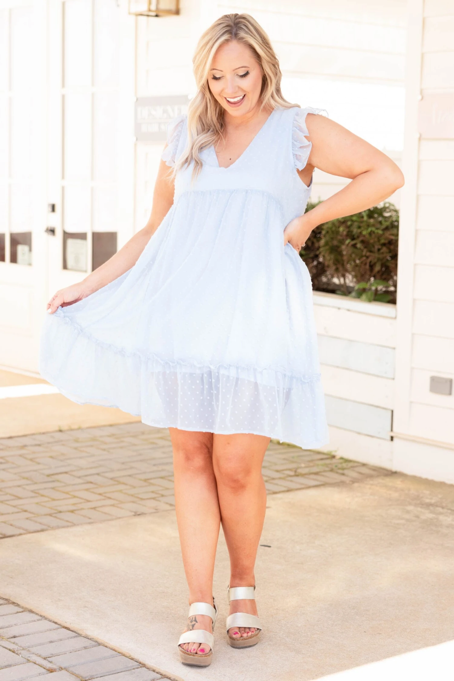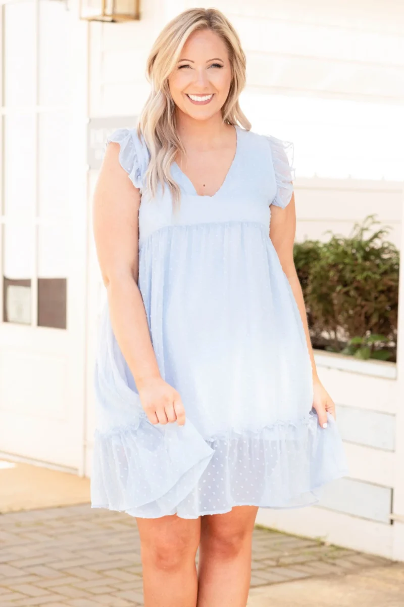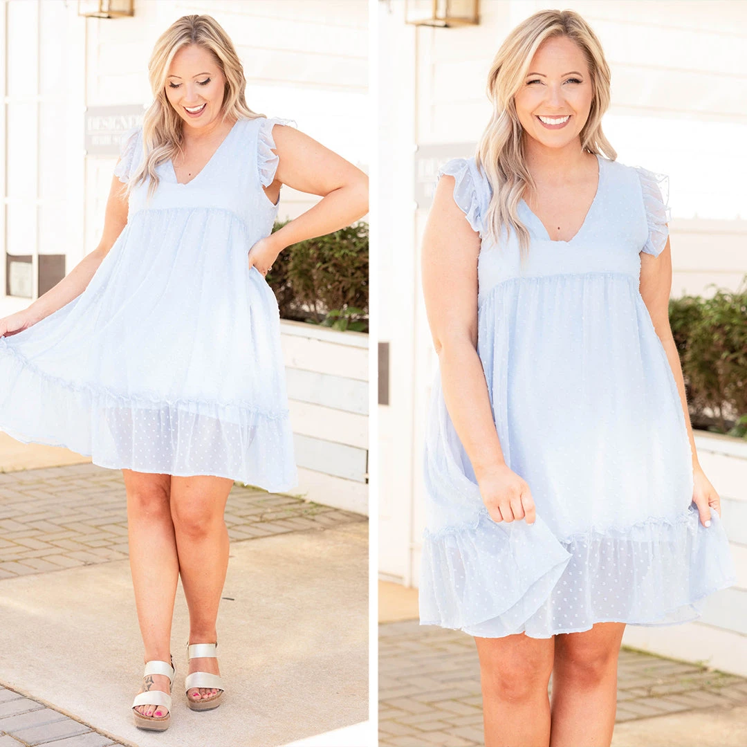 Look as sweet as can be in this dress! The light blue color is so classic and the babydoll style has us swooning! The ruffles on the sleeve and hem give this a sweet feminine feel! Style it with some wedges or heels for a great look at your next event!
