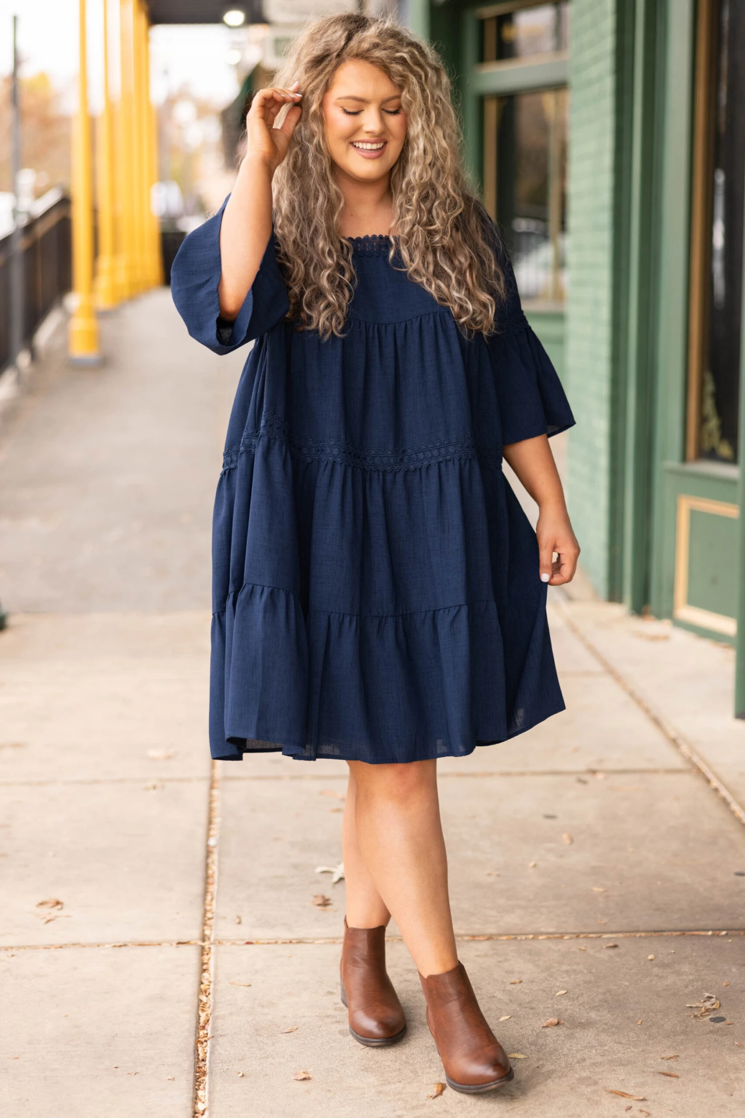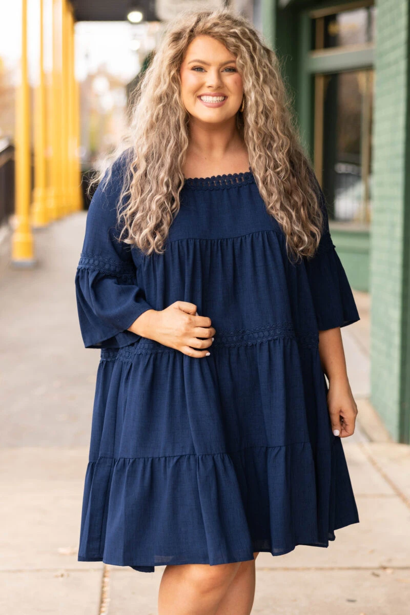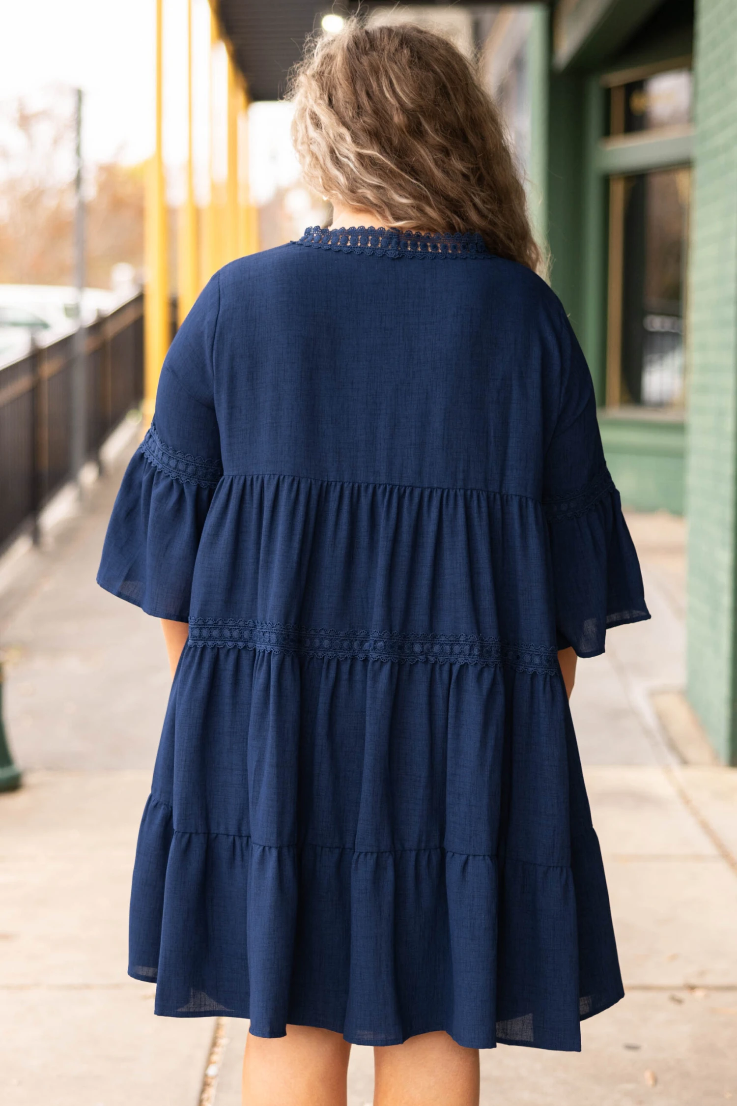 This is the sweetest dress yet! This dress is a solid blue color you can dress up or down for every occasion! It’s comfortable for all-day wear, has a figure-flattering fit, and features the cutest lace detailing! We love this dress paired with some cute accessories and booties for a classic look at your next holiday event!
