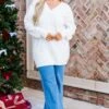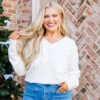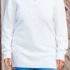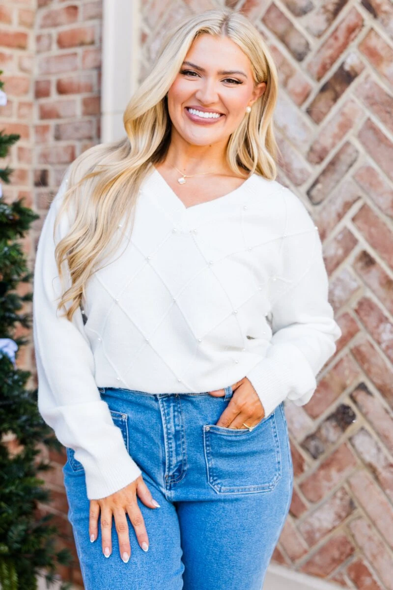 Indulge in the essence of luxury with this sweater in white! This long sleeve knit sweater boasts a flattering v neckline and delicate ribbed cuff sleeves with intricate checkered stitching and elegant pearl detailing! Elevate your wardrobe with this exclusive and sophisticated piece!