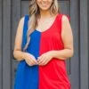 You’ll look so sweet in this adorable top! It features adorable shoulder ties and a figure-flattering fit that is perfect for the season! Its colorblock design in blue and red adds a touch of charm to any outfit! Made with a comfy fit, it’s perfect for pairing with white denim or distressed skinnies for a classic chic look!