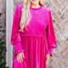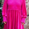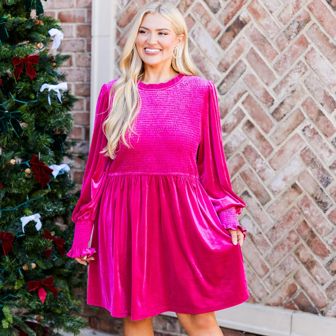 Don’t take too much time or you might miss out on this beauty! This dress has a solid magenta color that is perfect for the season! It has a smocked bodice, flowy fit, and features the softest velvet material! Style this dress with heels and your favorite accessories for an unforgettable chic look!Â