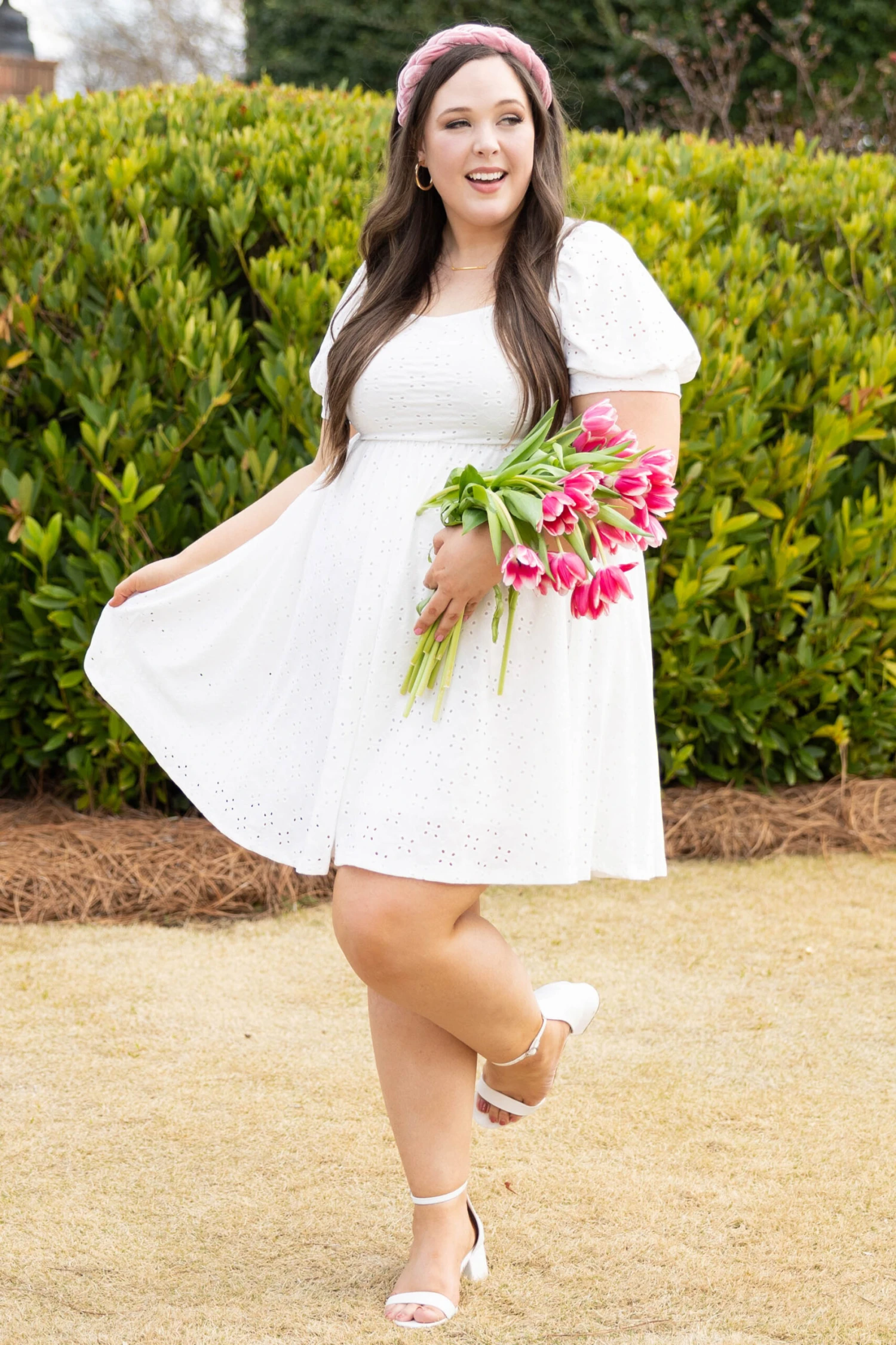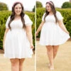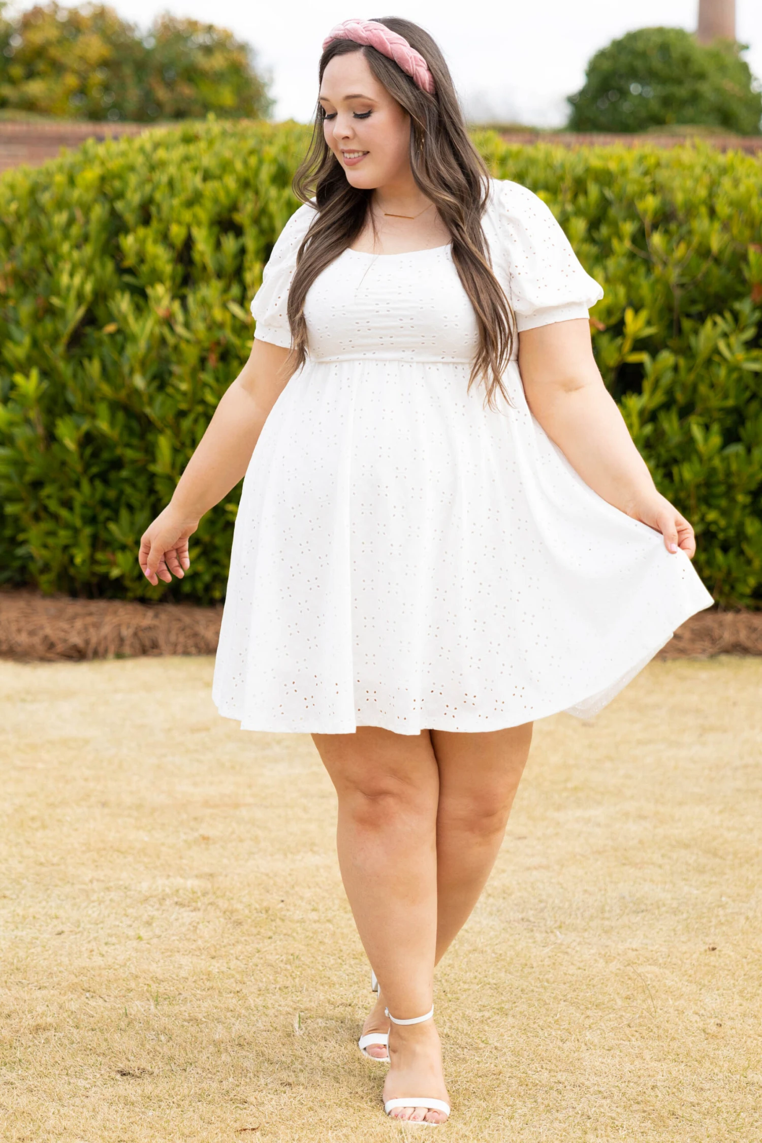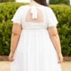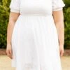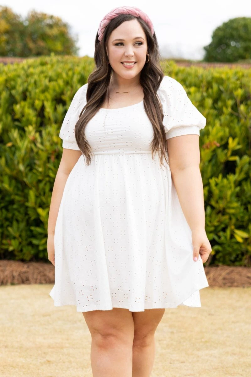 Take control in this amazing dress! This cutie has trendy puff sleeves, a beautiful eyelet lace design, and a super cute keyhole back with a tie! The white color is perfect for spring and can be paired with a colorful accessory for a pop! We love it with some heels and a cute headband for the perfect look this season!