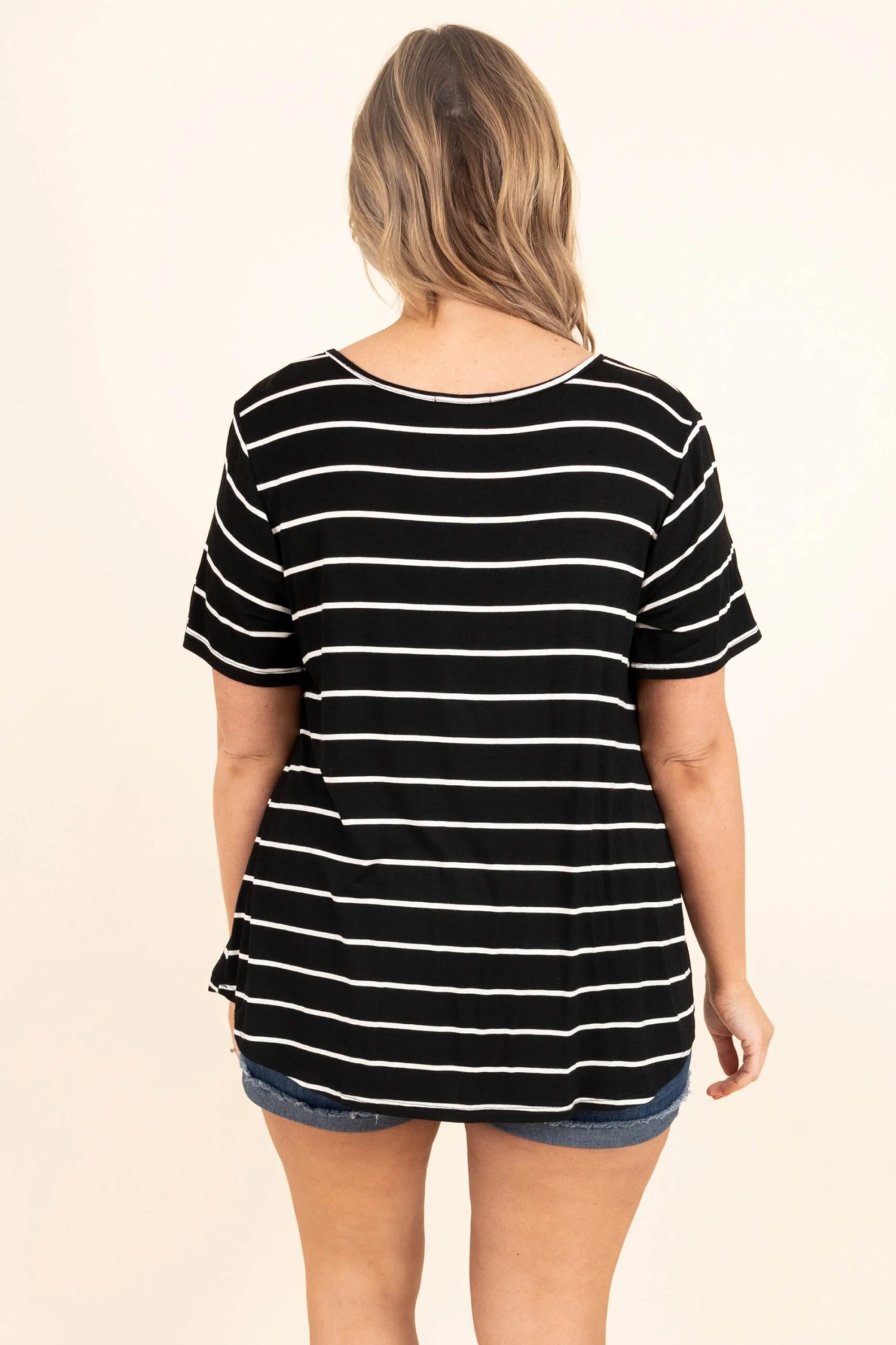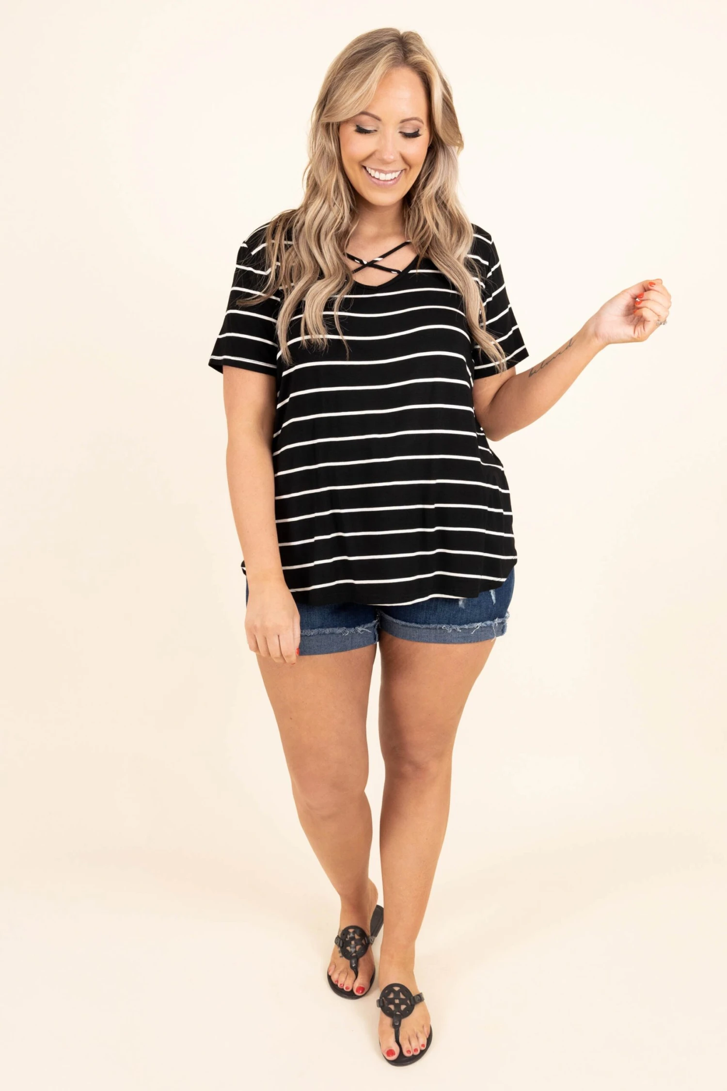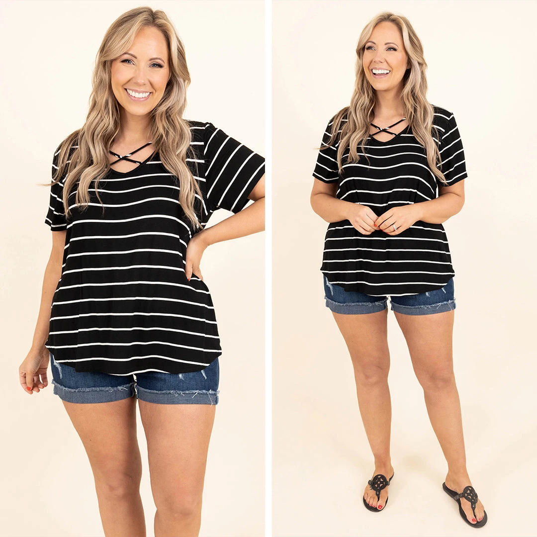 Let’s talk about this beautiful top! It has a neutral color with a striped pattern that is oh so chic! The stretchy, figure flattering fit pairs well with shorts or skinnies for a casual chic look!