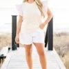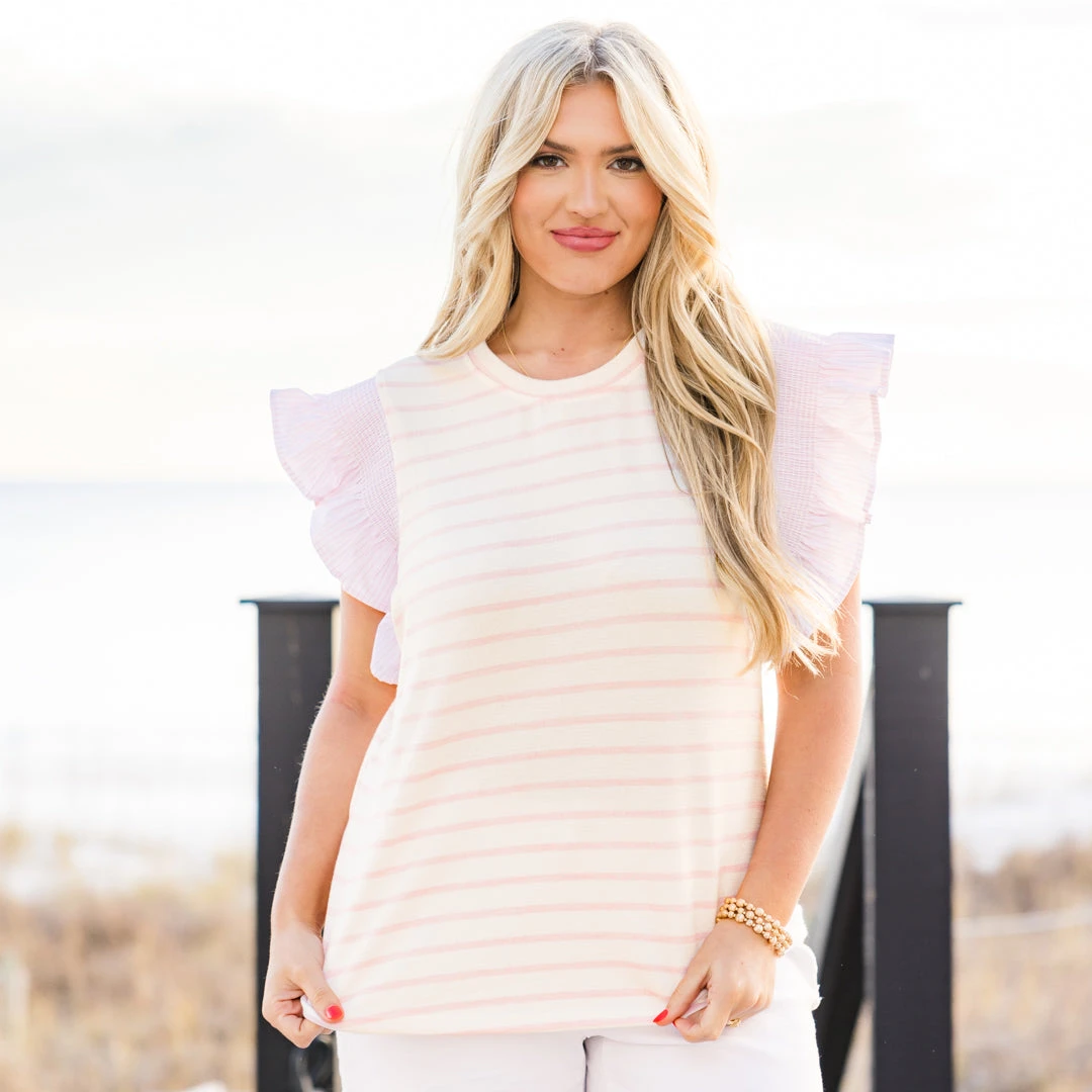Add a pop of personality to your wardrobe with this top in playful pink-ivory!The horizontal striped bodice adds a touch of fun, while the contrast ruffle sleeves bring a stylish twist! Stand out with pride in this unique and charming top!