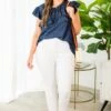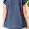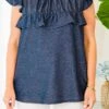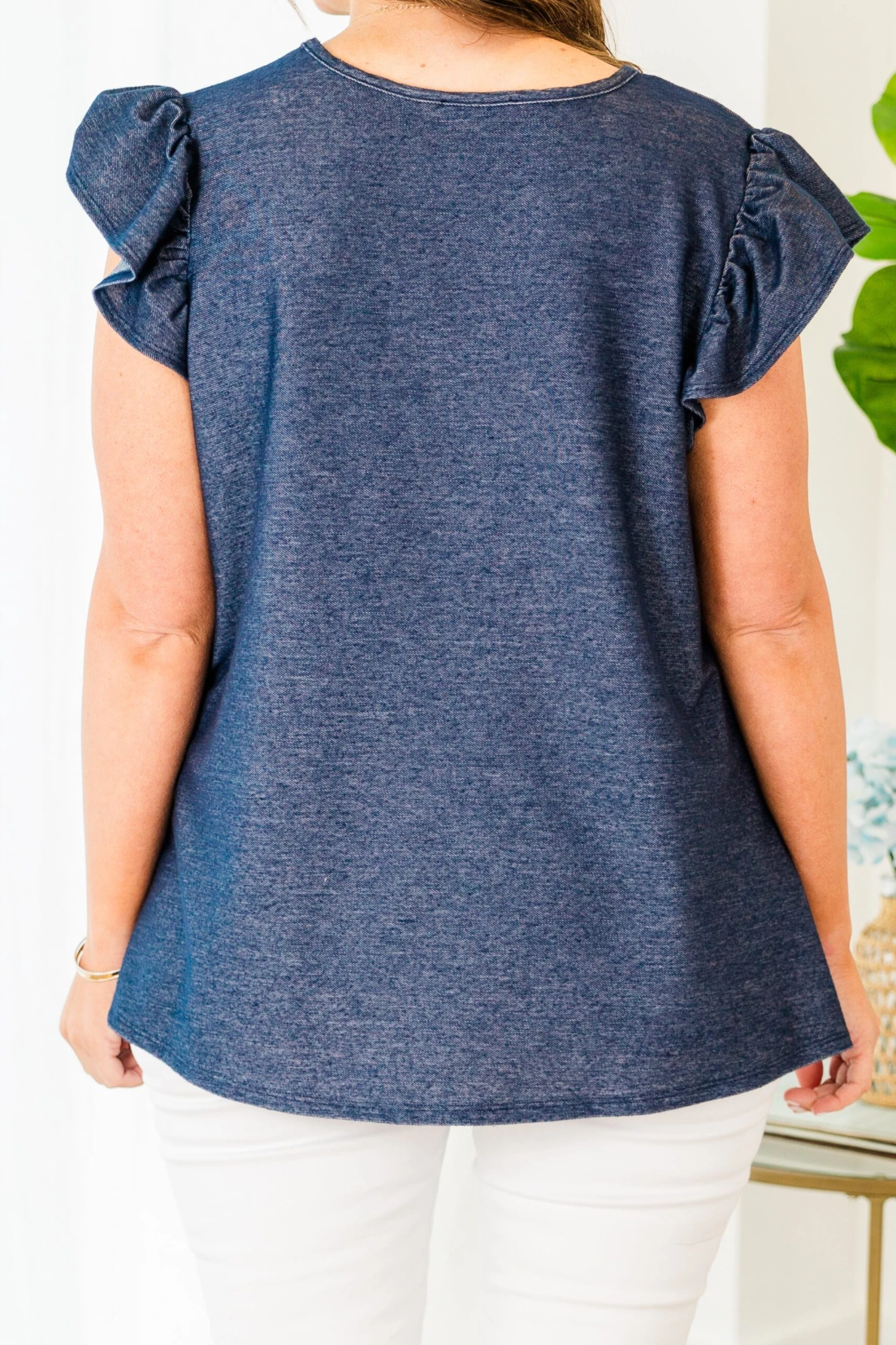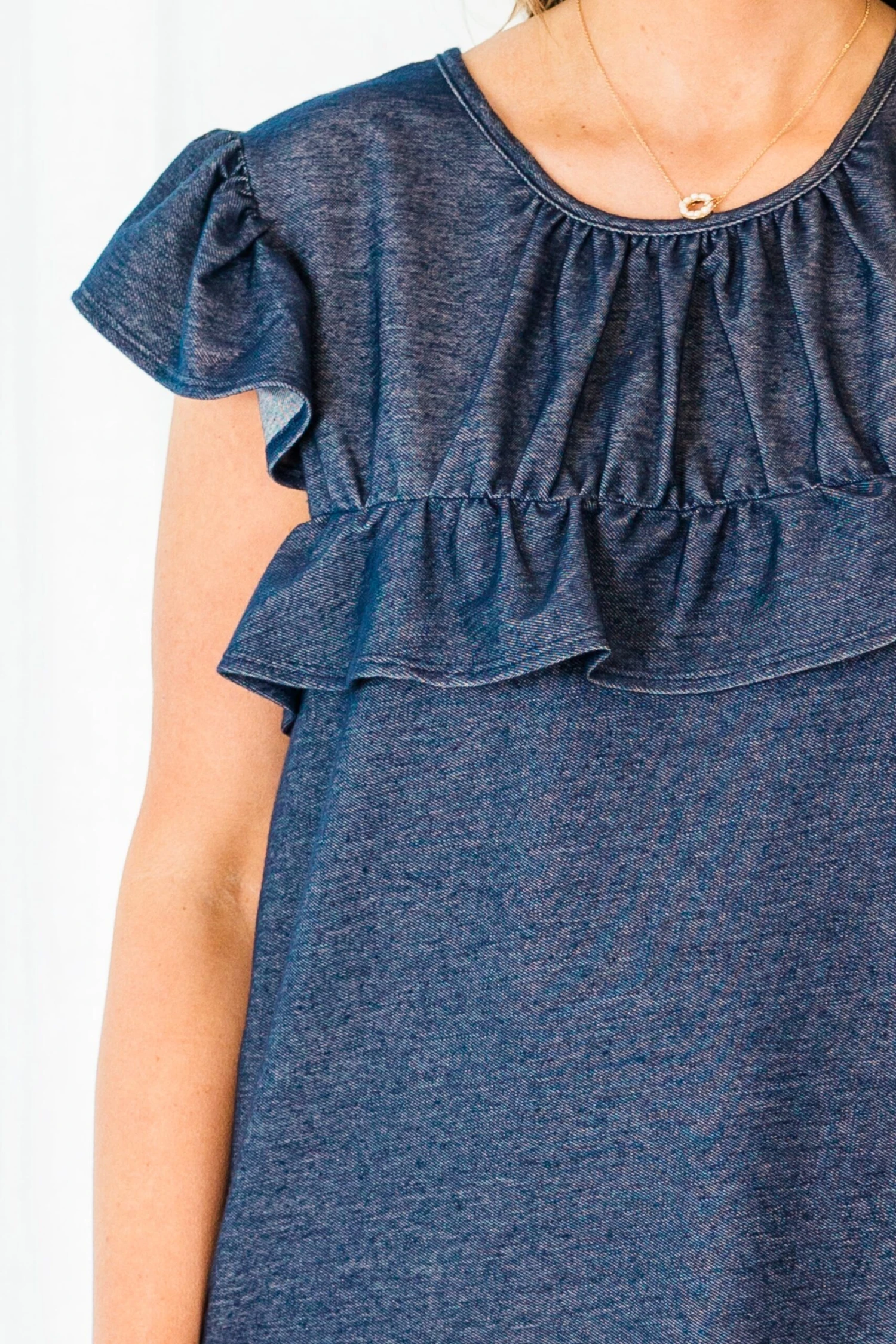 Introducing the Talk About That Top in a gorgeous blue hue. Made with comfy fabric and featuring stylish ruffle detailing, this top is perfect for any occasion. Its versatile design pairs well with white denim and cute accessories, making it a must-have for your wardrobe.