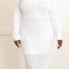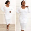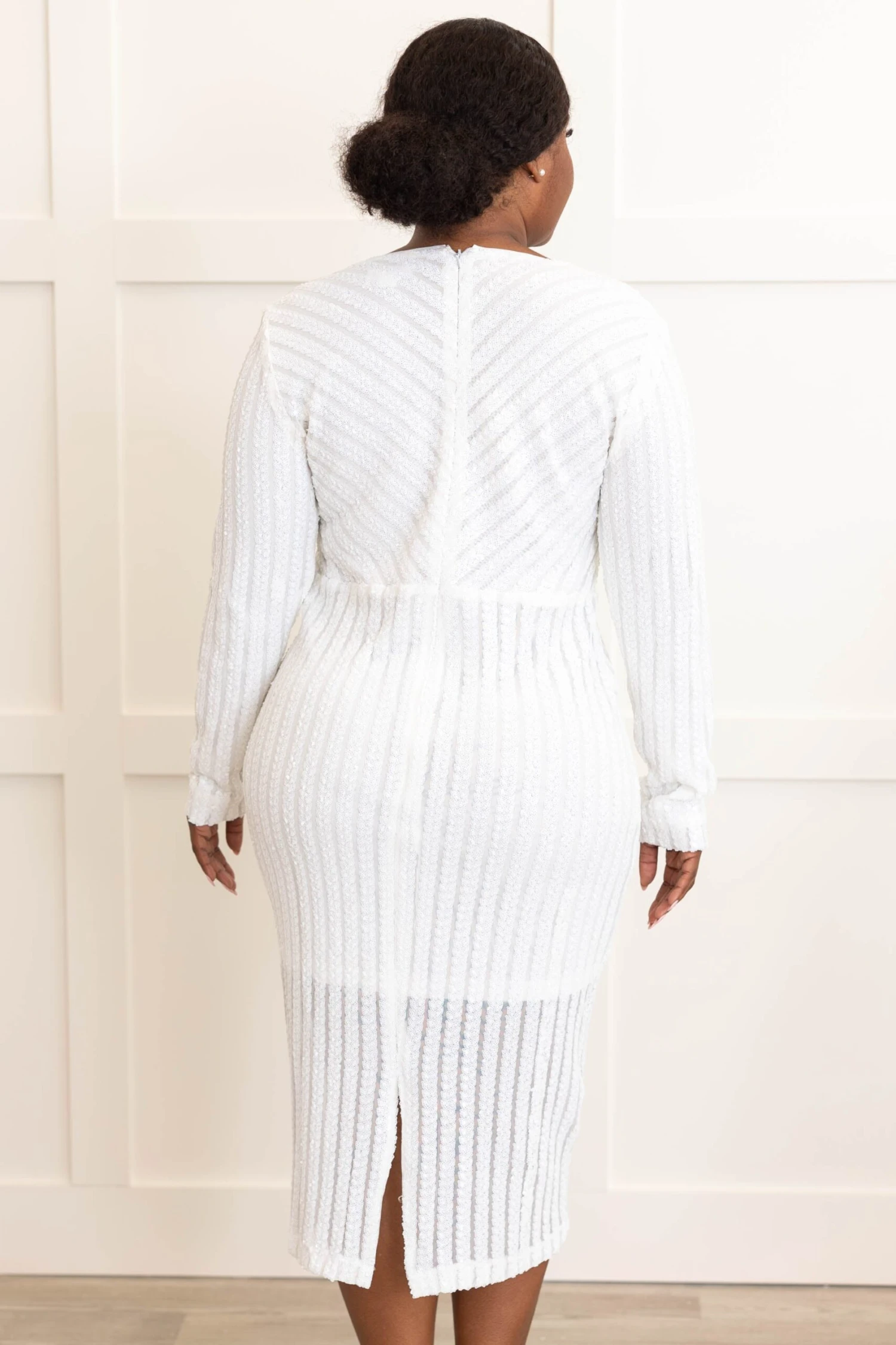 This dress will have you looking like a star! The white color with the white sequin stripes has this dress demanding to be the center of attention! The midi length is so trendy and elegant with a v-neckline that is so flirty! Style this with some heels to look like a million dollars!