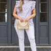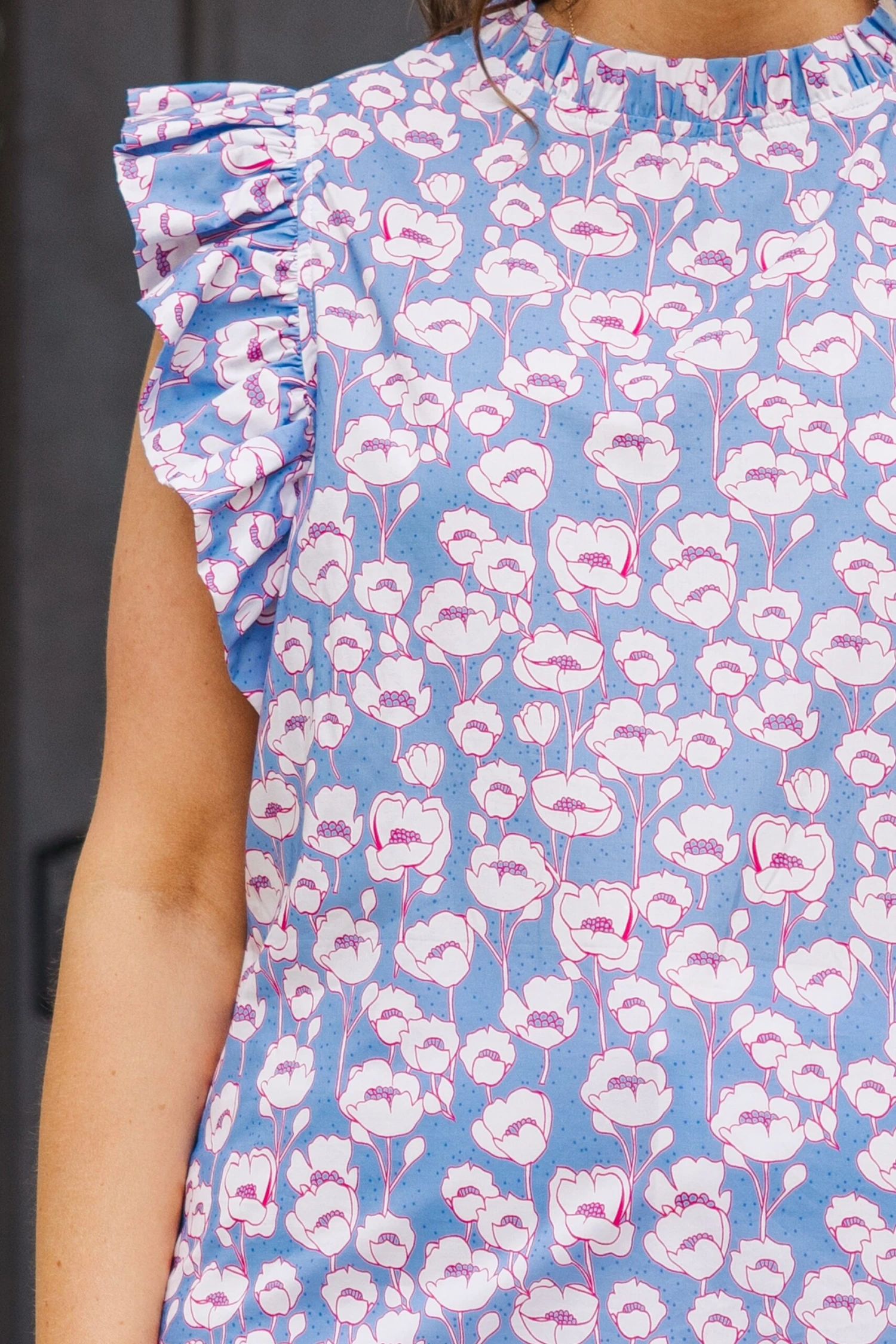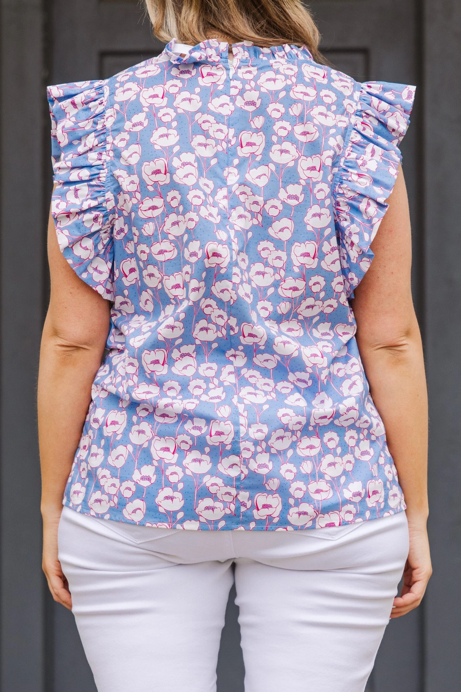 Add a touch of elegance to your wardrobe with our Tall Poppies Top! Featuring flutter sleeves and a pretty blue floral pattern, this top is perfect for a brunch date or day at the office.! Elevate your style and stand out from the crowd all throughout the season!