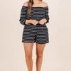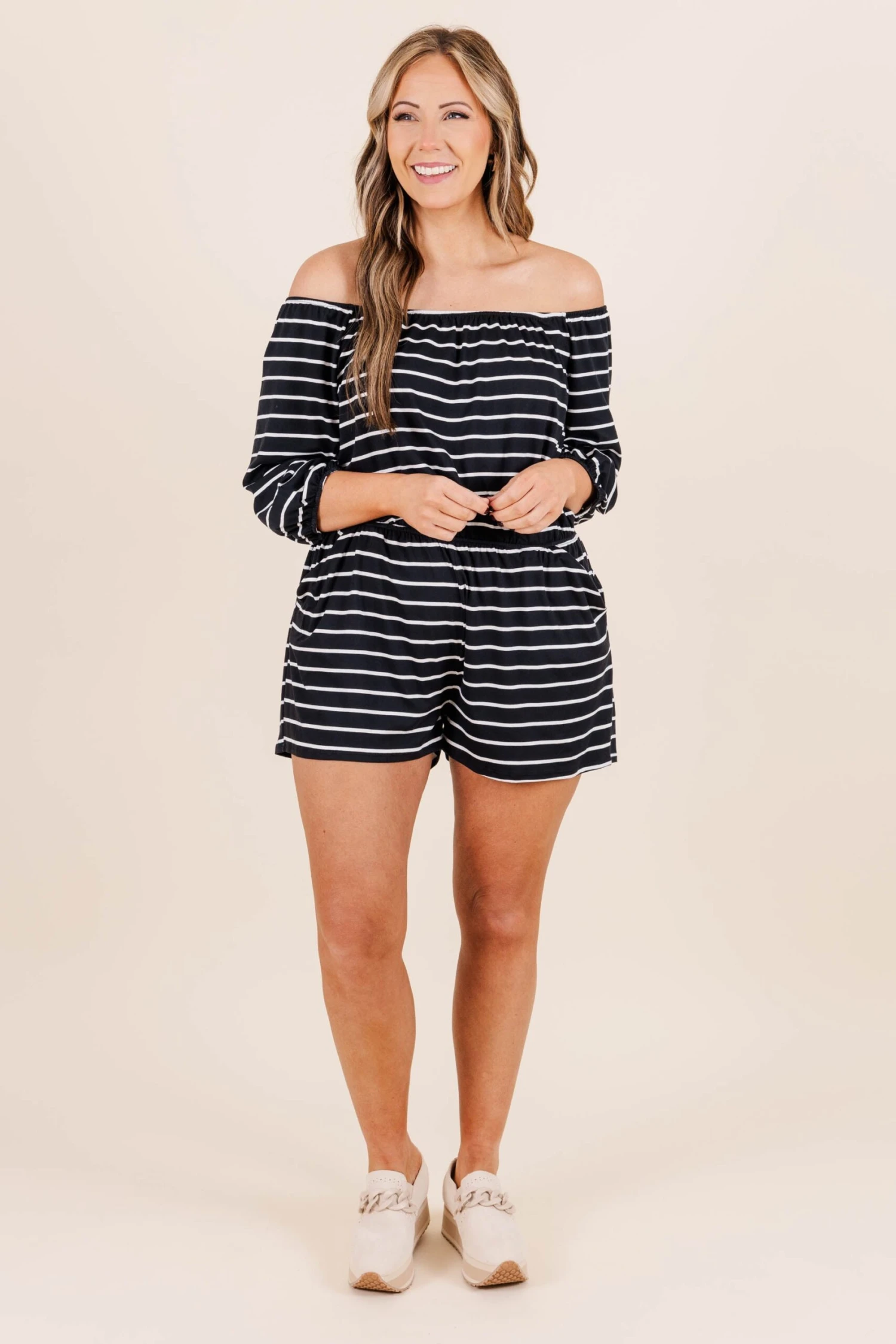 This romper is calling your name! It features an off the shoulder design and a classic stripe pattern, making it the perfect choice for a night out! The neutral color easily pairs with any accessories, making it a versatile addition to your wardrobe! Bring style and comfort to your next evening out!