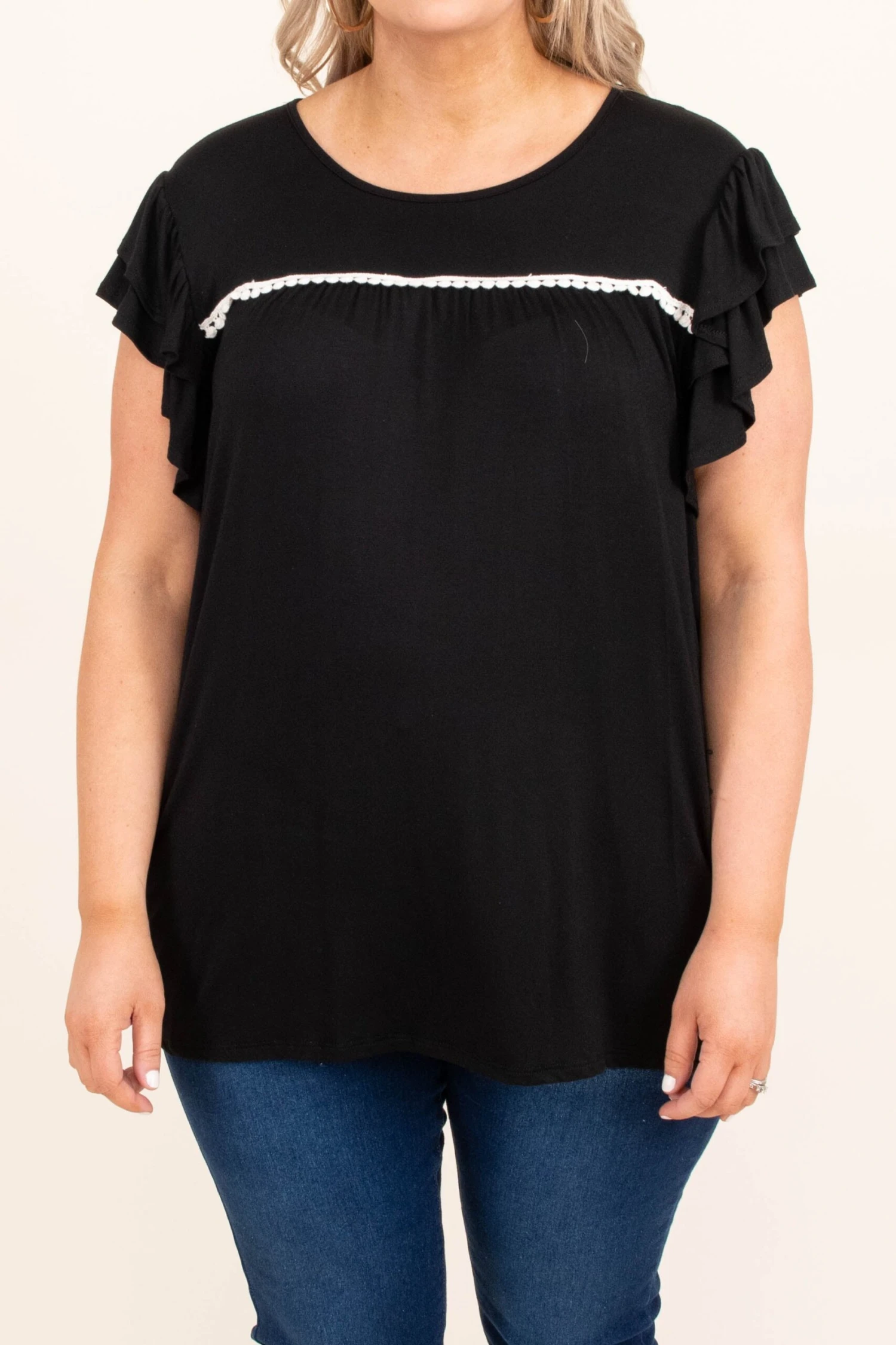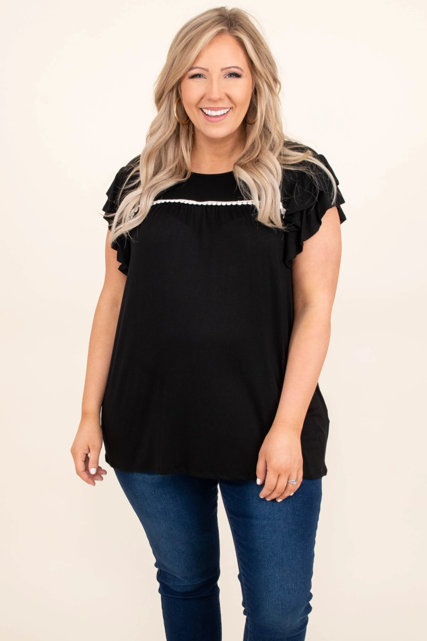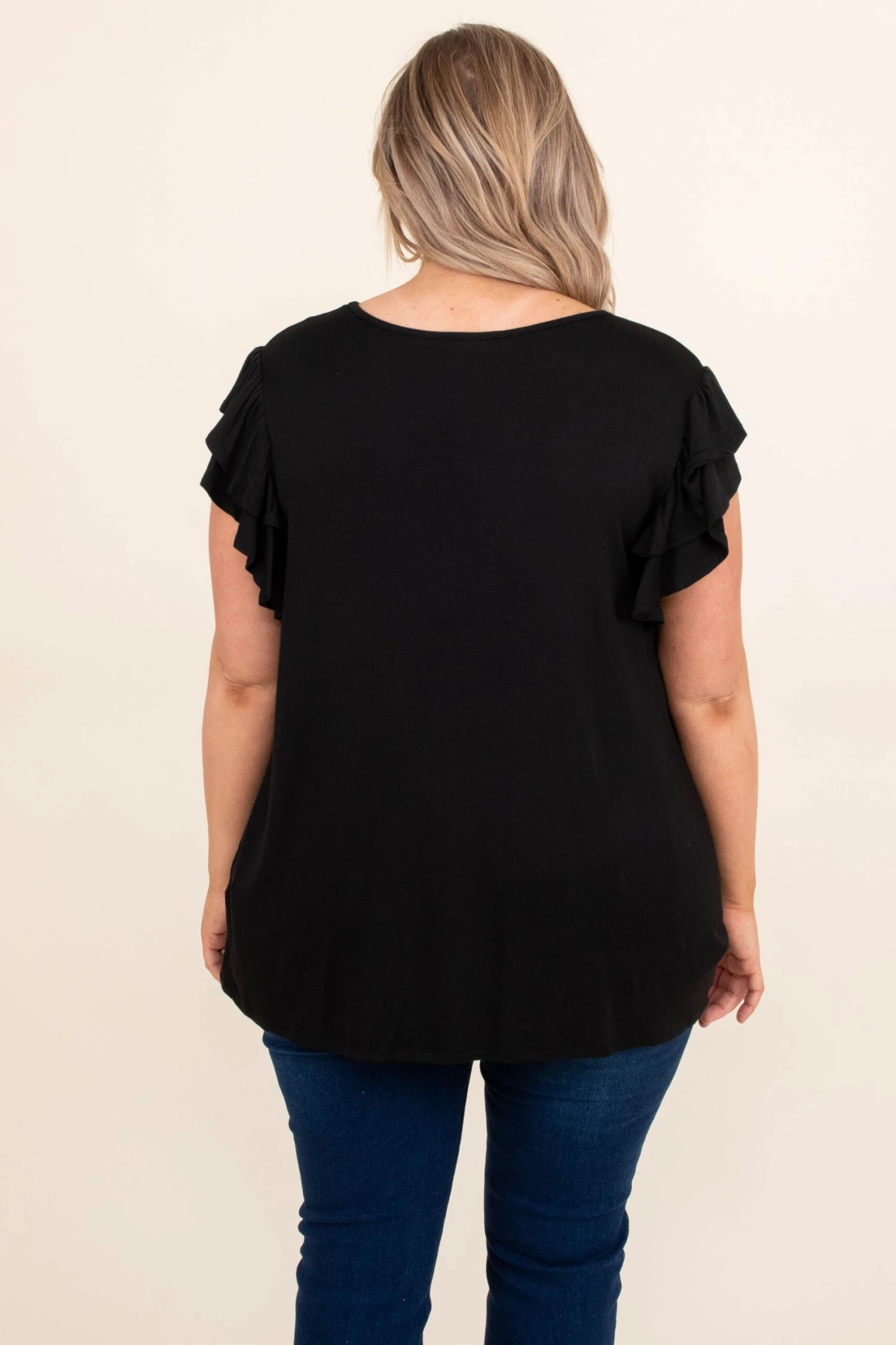 Start the first chapter of your book by throwing on this adorable top! The material is so soft we can’t get over it and the flutter sleeves are a flirty touch! The solid black color can be paired with anything making this top the ultimate staple piece! Pair it with some skinnies and slides for a dressed down look or layer it under a jacket with some flares for a more elevated look!