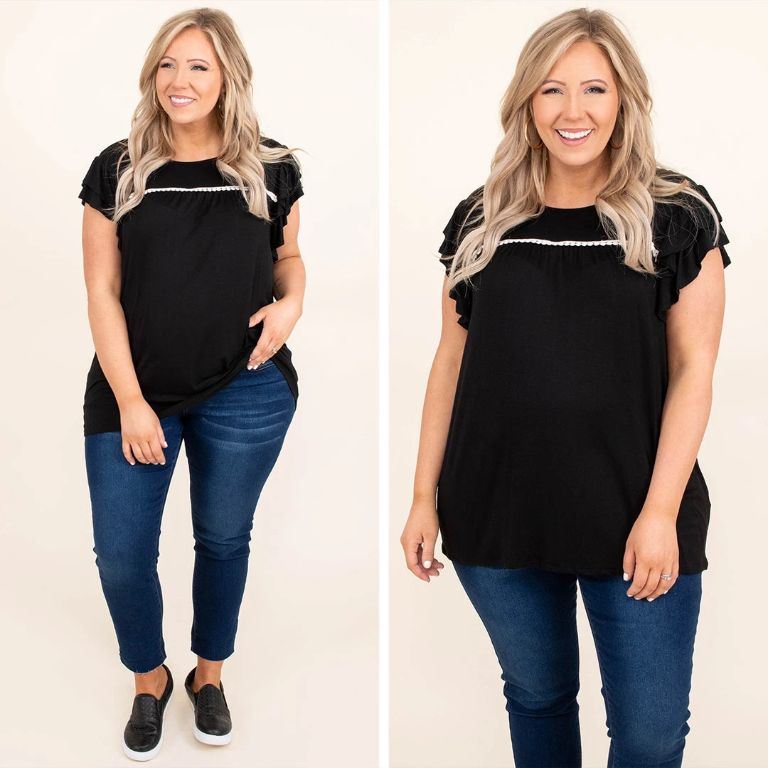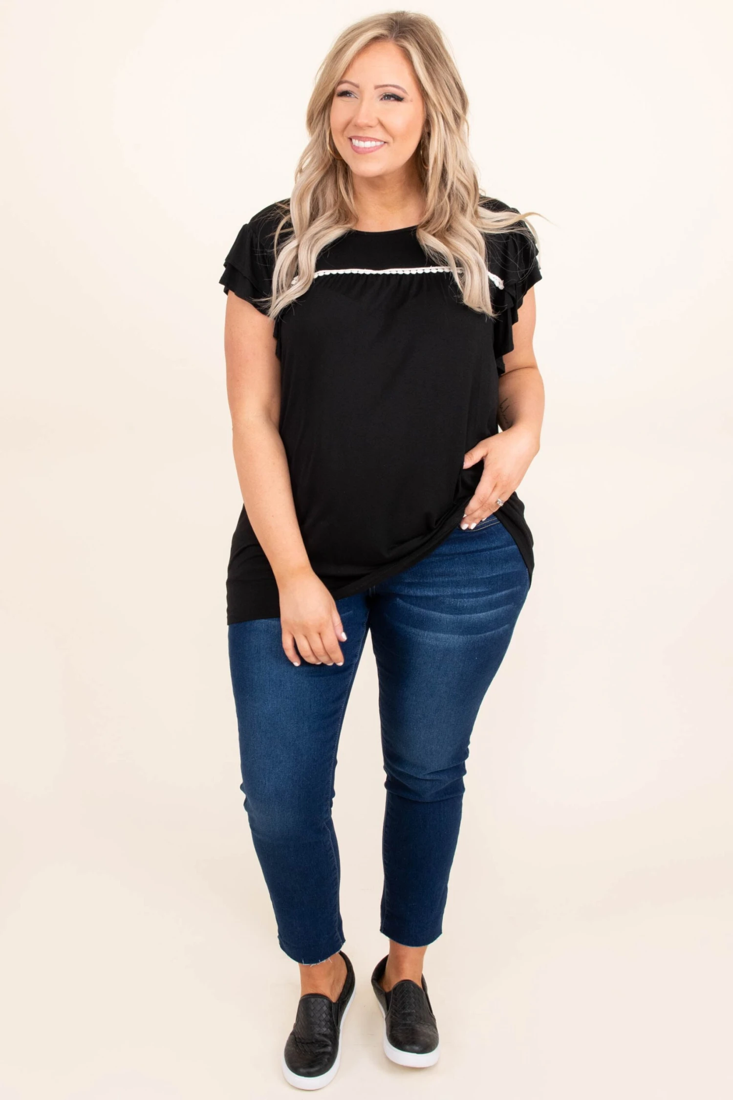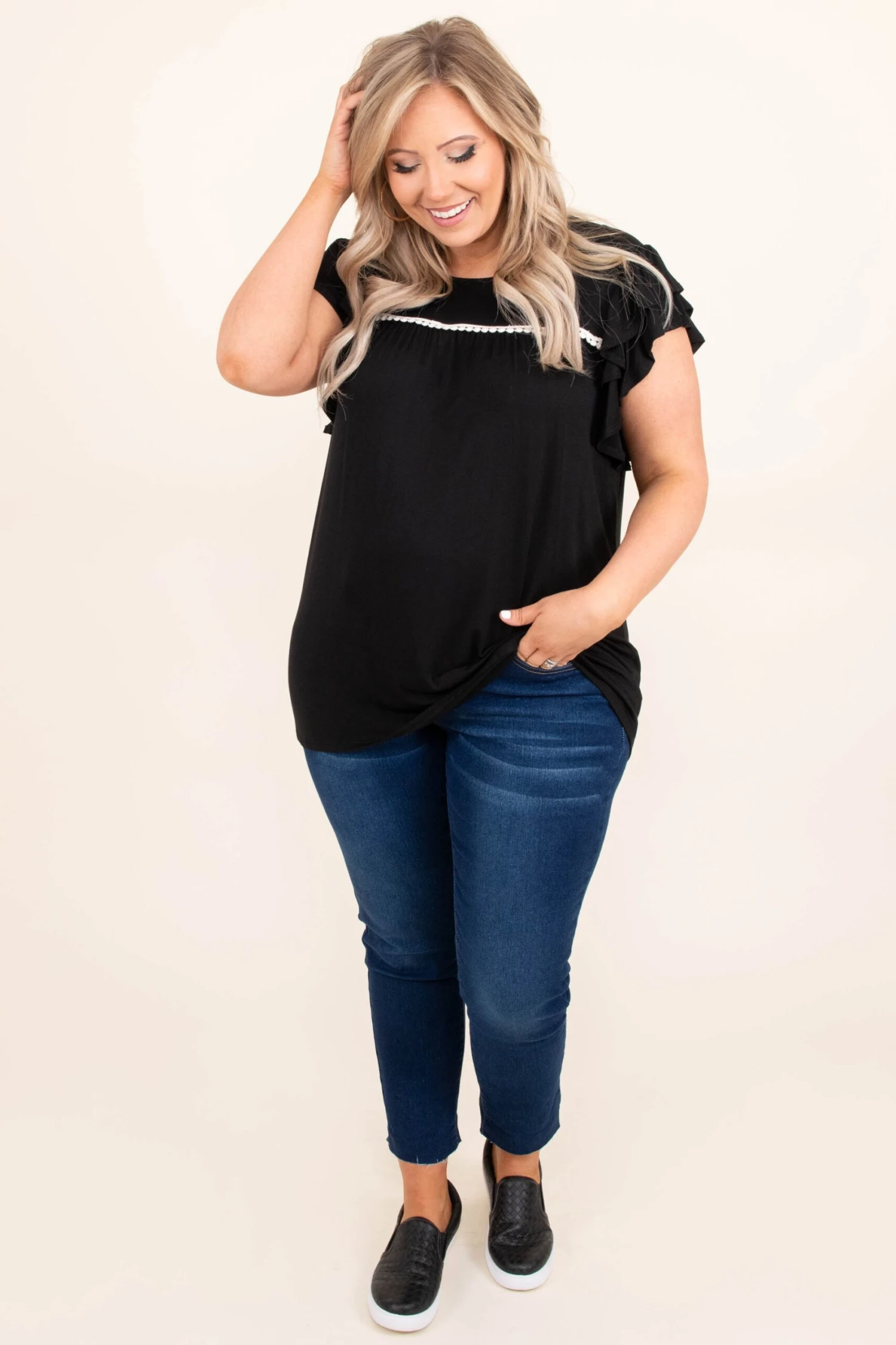 Start the first chapter of your book by throwing on this adorable top! The material is so soft we can’t get over it and the flutter sleeves are a flirty touch! The solid black color can be paired with anything making this top the ultimate staple piece! Pair it with some skinnies and slides for a dressed down look or layer it under a jacket with some flares for a more elevated look!