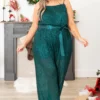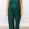 This jumpsuit is just the glam your closet needs this season! It has a dark green color with silver sequins all over and a super flattering cinched waist! The straps adjust so you can stay comfy and the tie is so stylish! Pair this with some heels and you have a fab look at your next event!