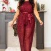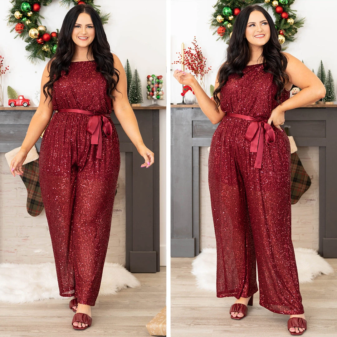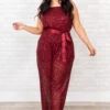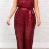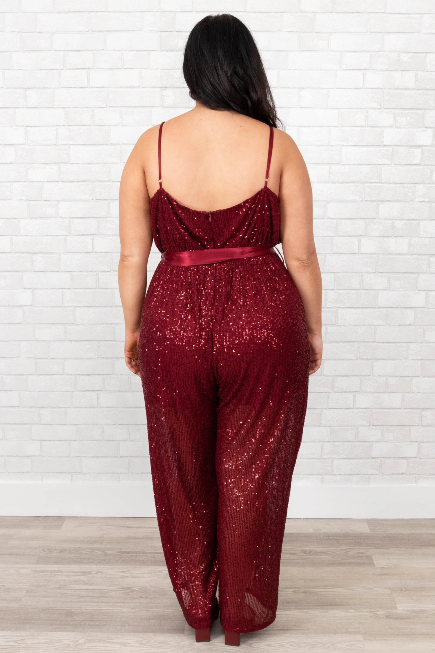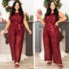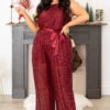 This jumpsuit is just the glam your closet needs this season! It has a wine color with silver sequins all over and a super flattering cinched waist! The straps adjust so you can stay comfy and the tie is so stylish! Pair this with some heels and you have a fab look at your next event!