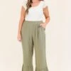 Introducing our Mystery of Love Pants in dusty olive! Made with a comfortable linen blend, these wide leg pants feature pockets and an elastic waistband for the perfect fit! The tiered ruffled leg design adds a touch of flair to your wardrobe! Pair with your favorite blouse or bodysuit for a stylish and effortless look!