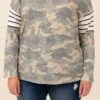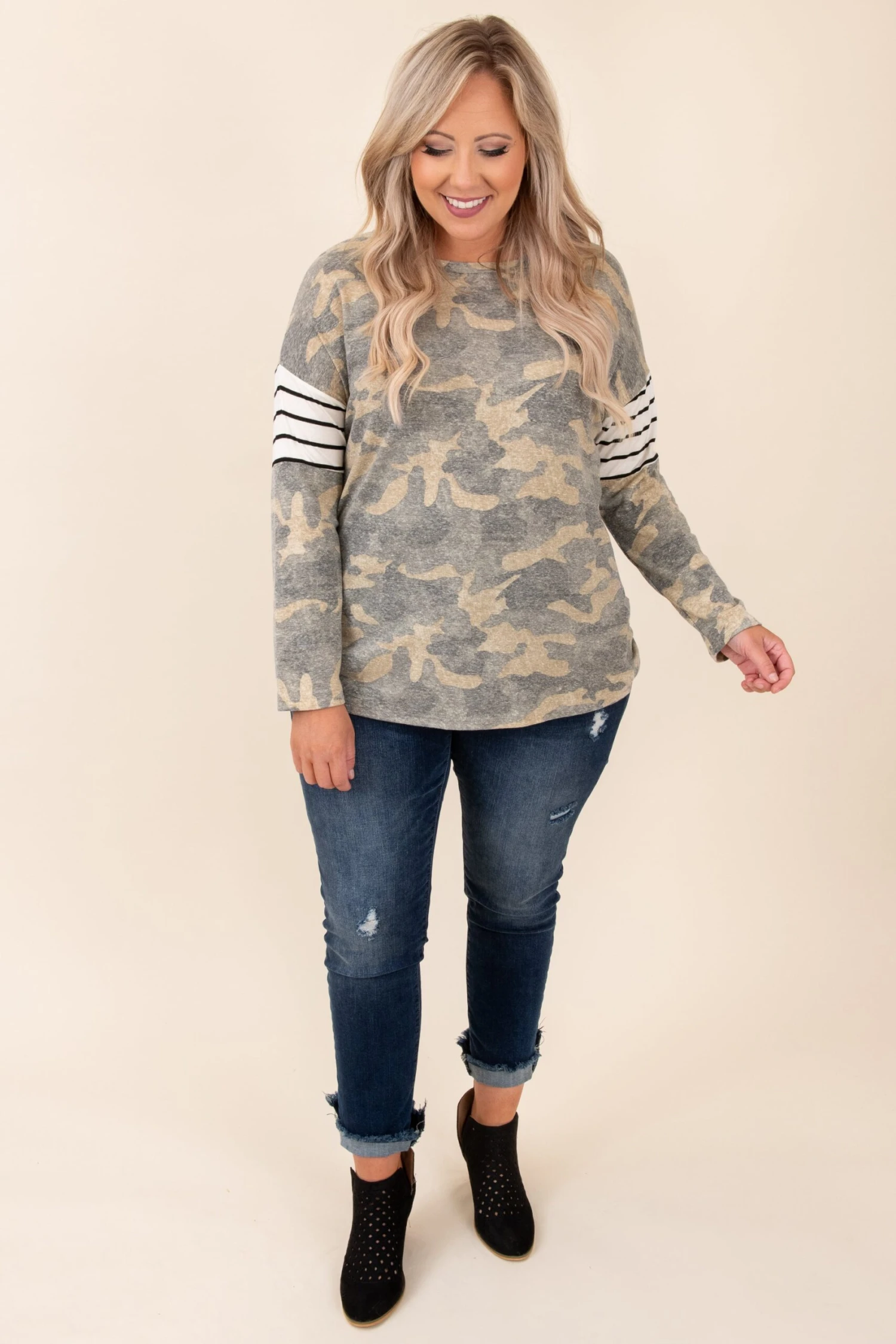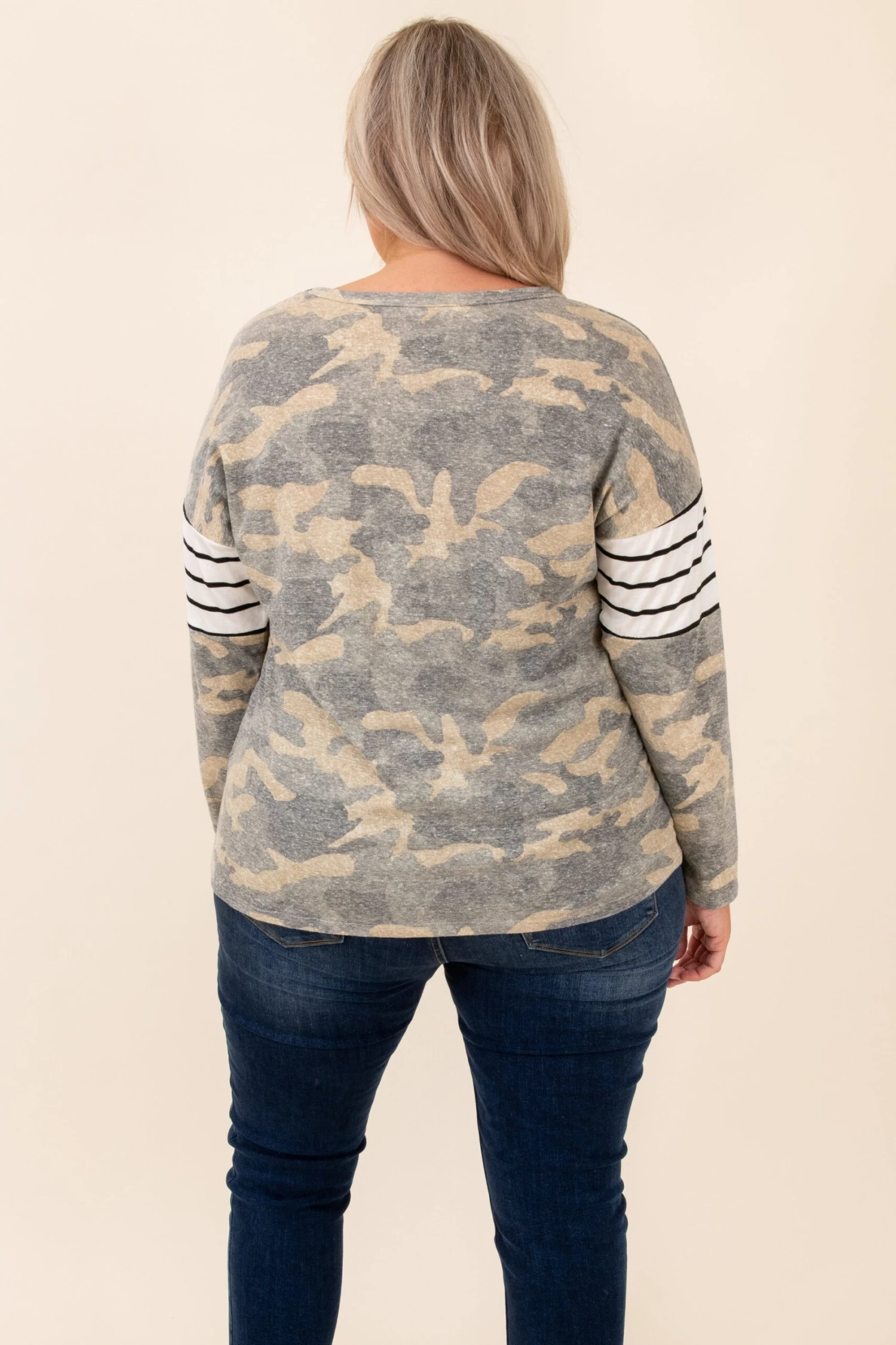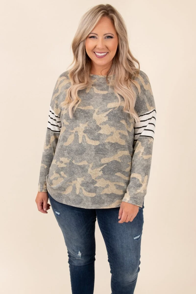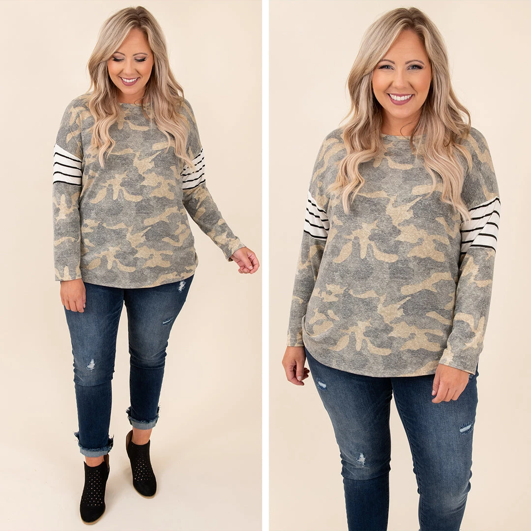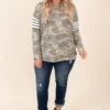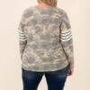 Want to reward yourself? Then simply add this top to your wardrobe! This top has a chic camo pattern with neutral colors you can style with your favorite shoes and accessories! It’s comfortable, figure-flattering, and has the cutest striped sleeve accent! Simply, style this piece with leggings or skinnies for an easy everyday look!