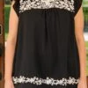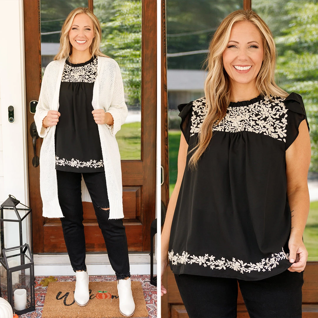 Introducing your new favorite top, a stylish and modern black top with flutter sleeves and a gorgeous floral embroidery design! Perfect for any casual occasion, this top is sure to add a touch of elegance to your wardrobe!