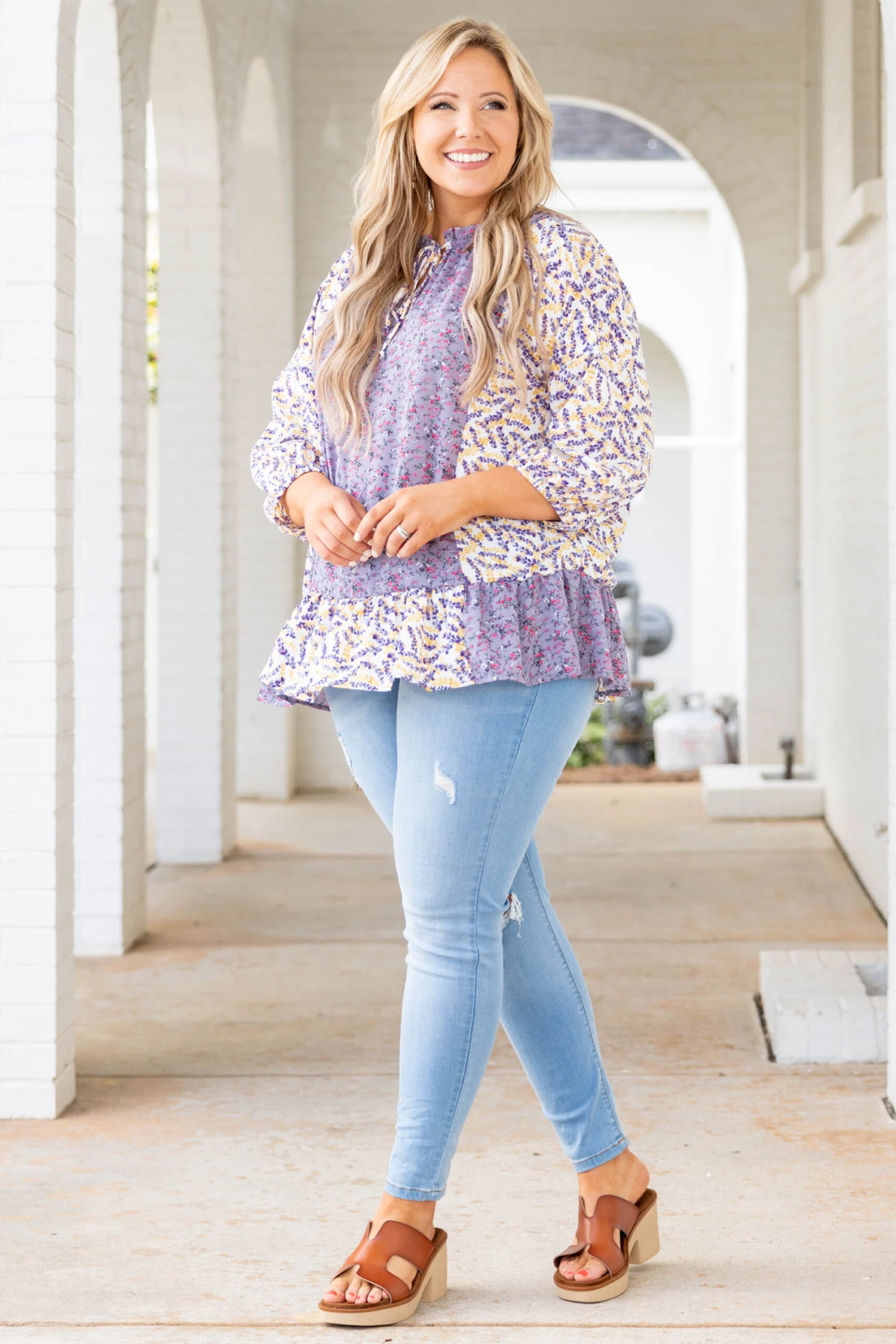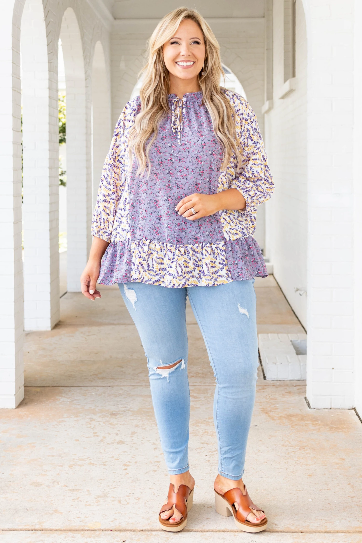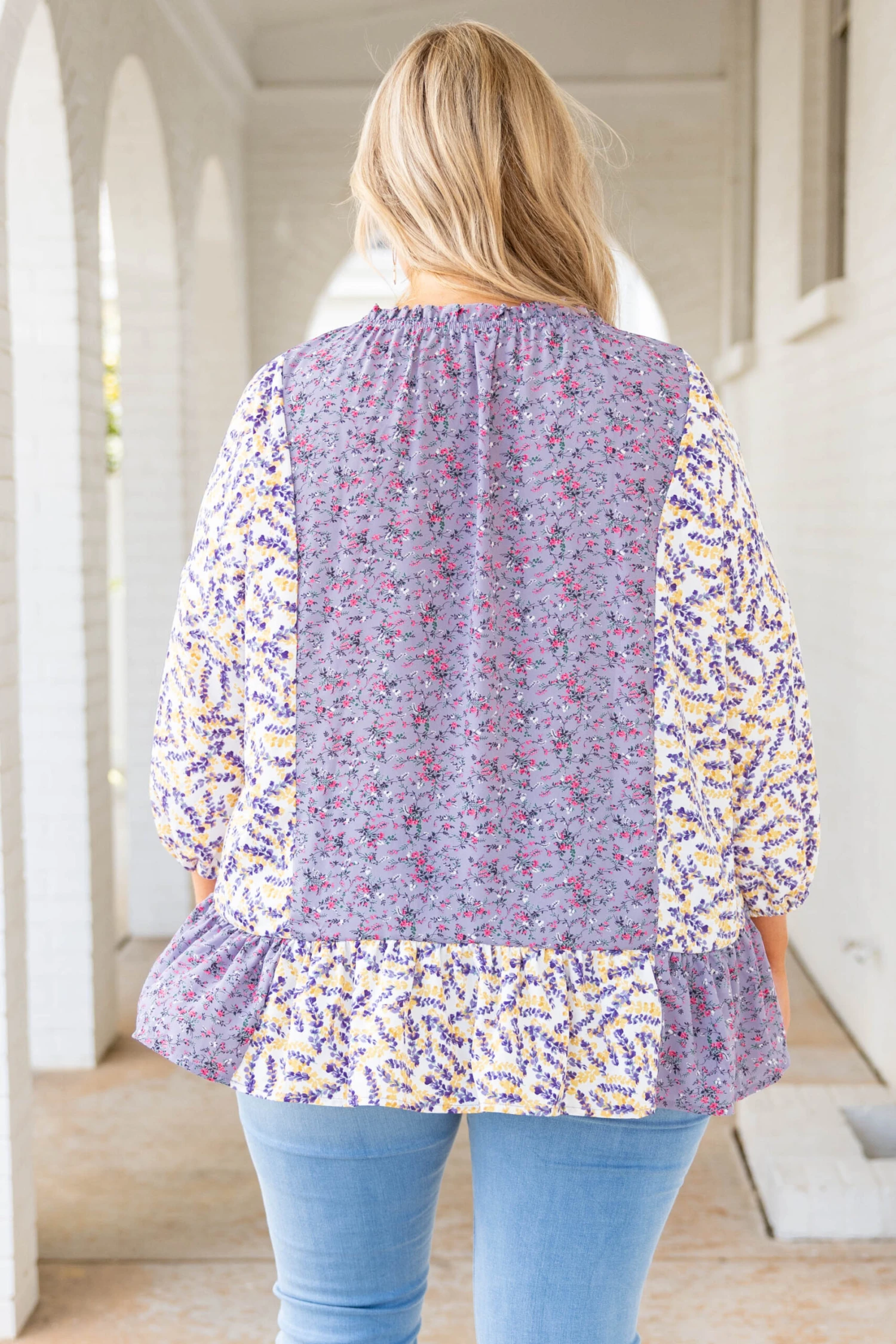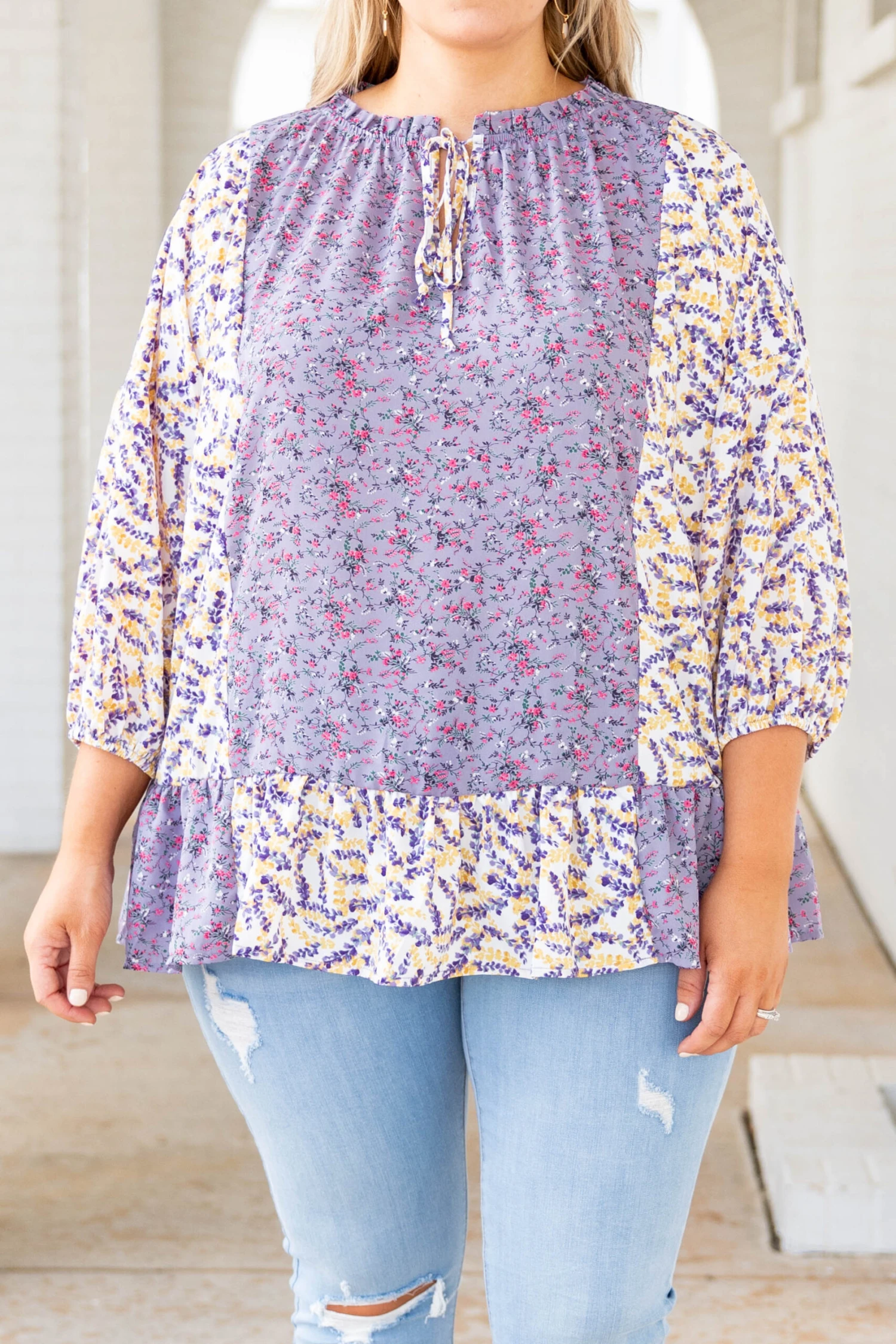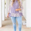 This top will only bring good troubles your way! The lovely floral pattern and bubble sleeves are perfect for the season! The lavender color pairs well with all your favorite pants! Simply style this top with some skinnies and wedges for a cute, stylish look!Â