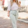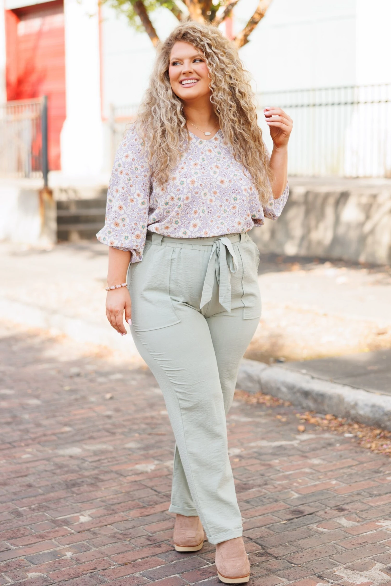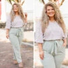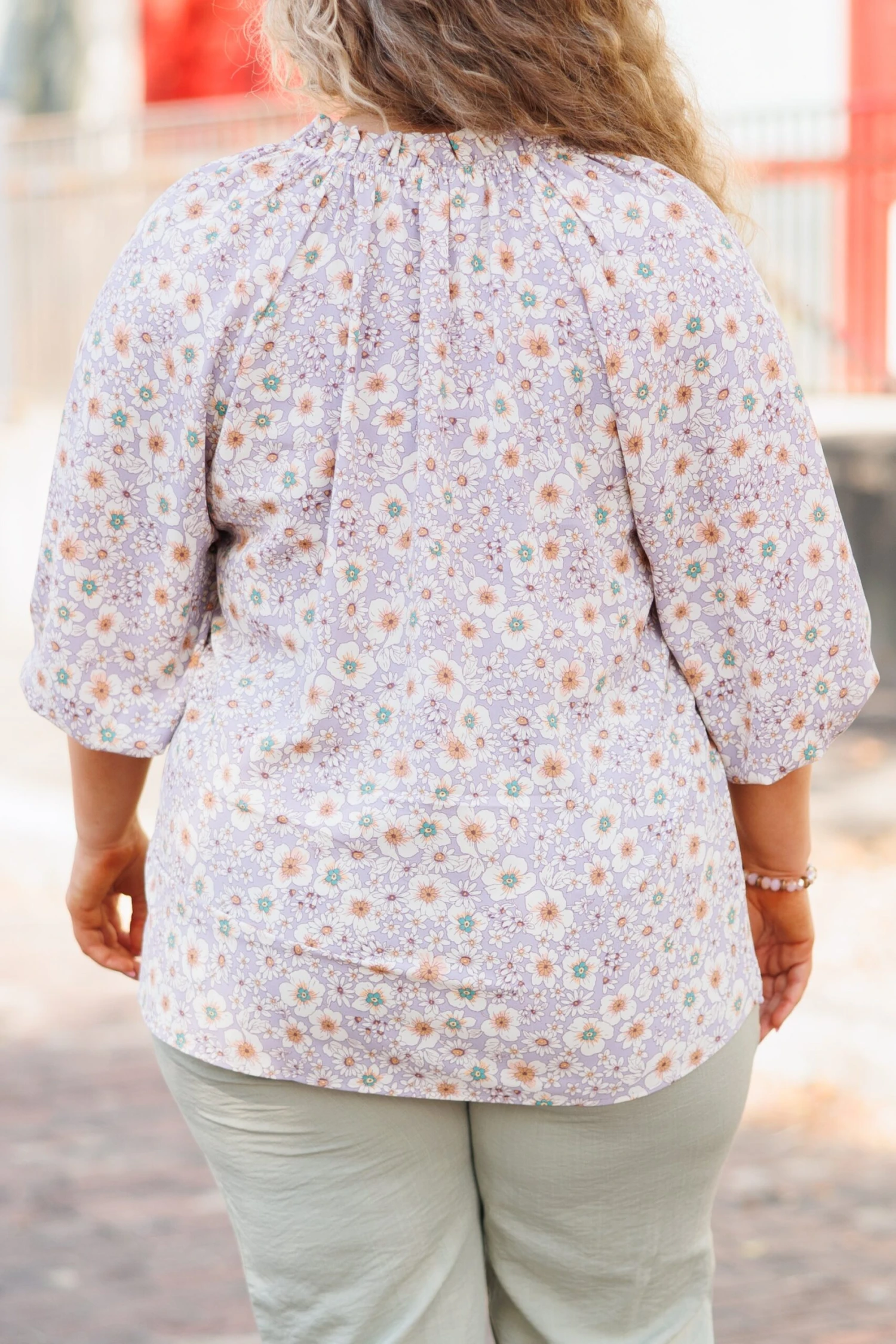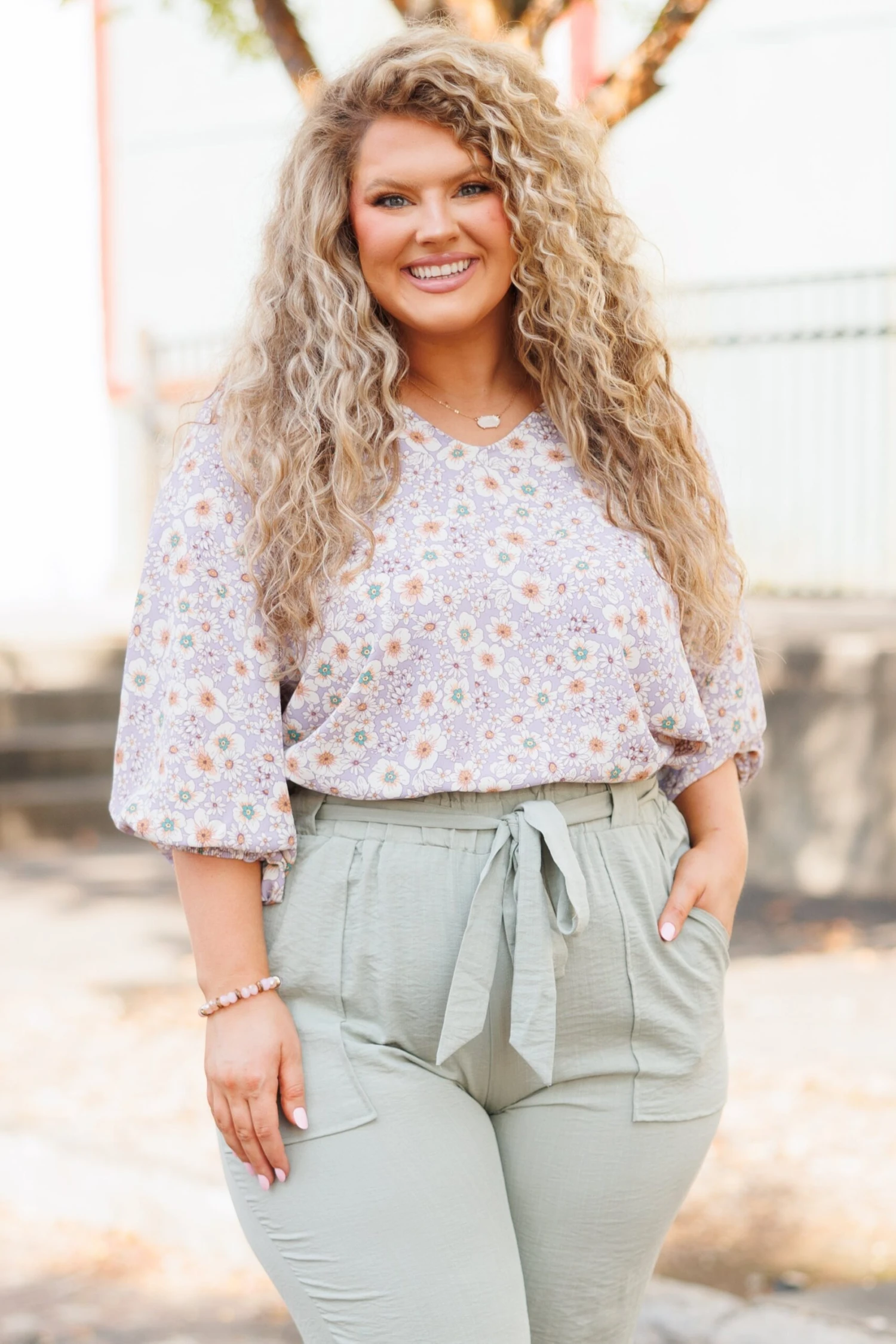 This top will have you thinking about how much you need it in your wardrobe! It has a beautiful lavender color and we love the pretty floral print paired with the bubble sleeves! Wear this beauty in the office or on your next brunch date!Â